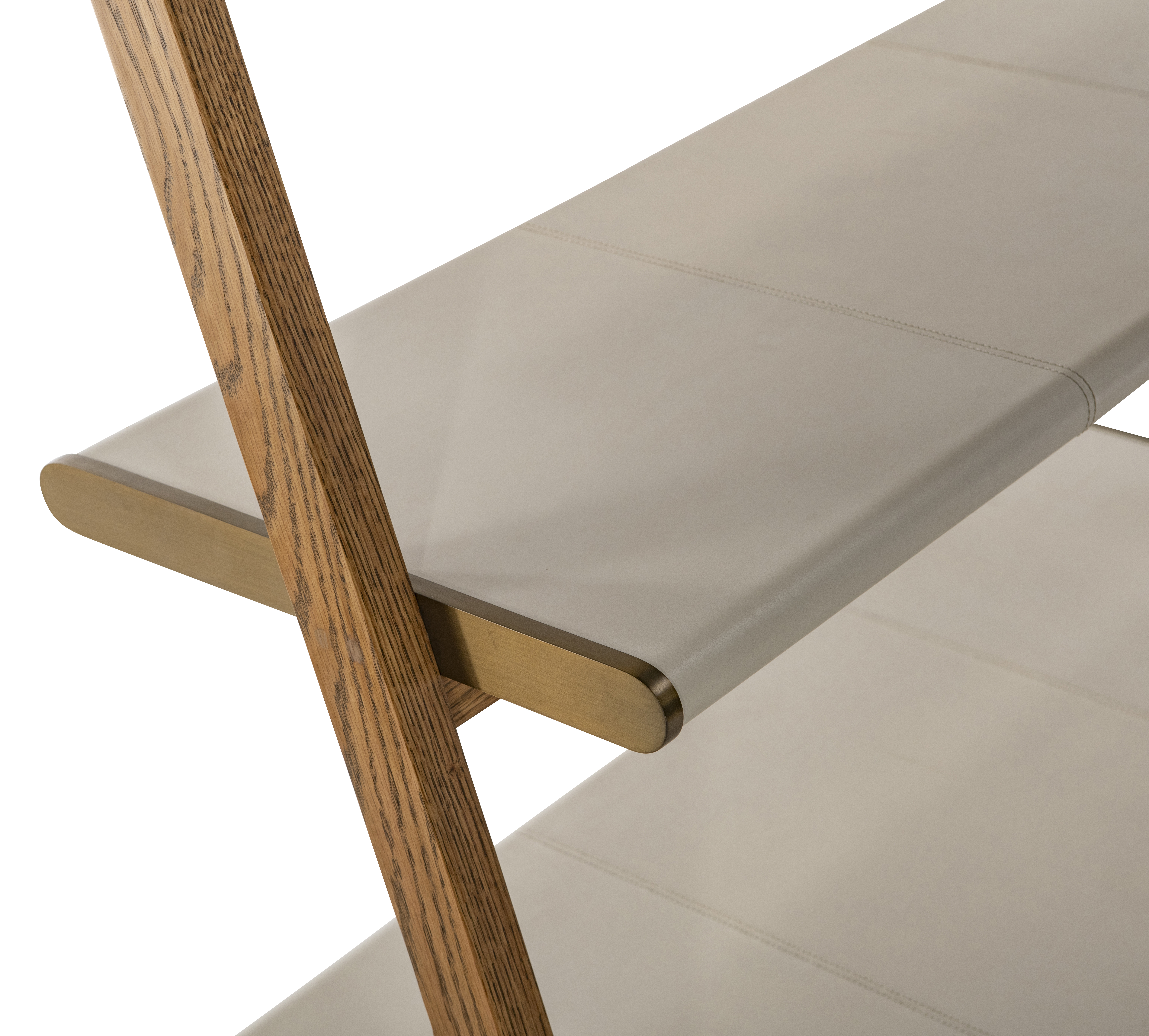 Sleek, sculptural, and functional, this ladder-style étagère reimagines modern display with refined craftsmanship. The light oak-finished frame leans gracefully against the wall, supporting tiered shelves wrapped in cream colored hand-stitched leather.