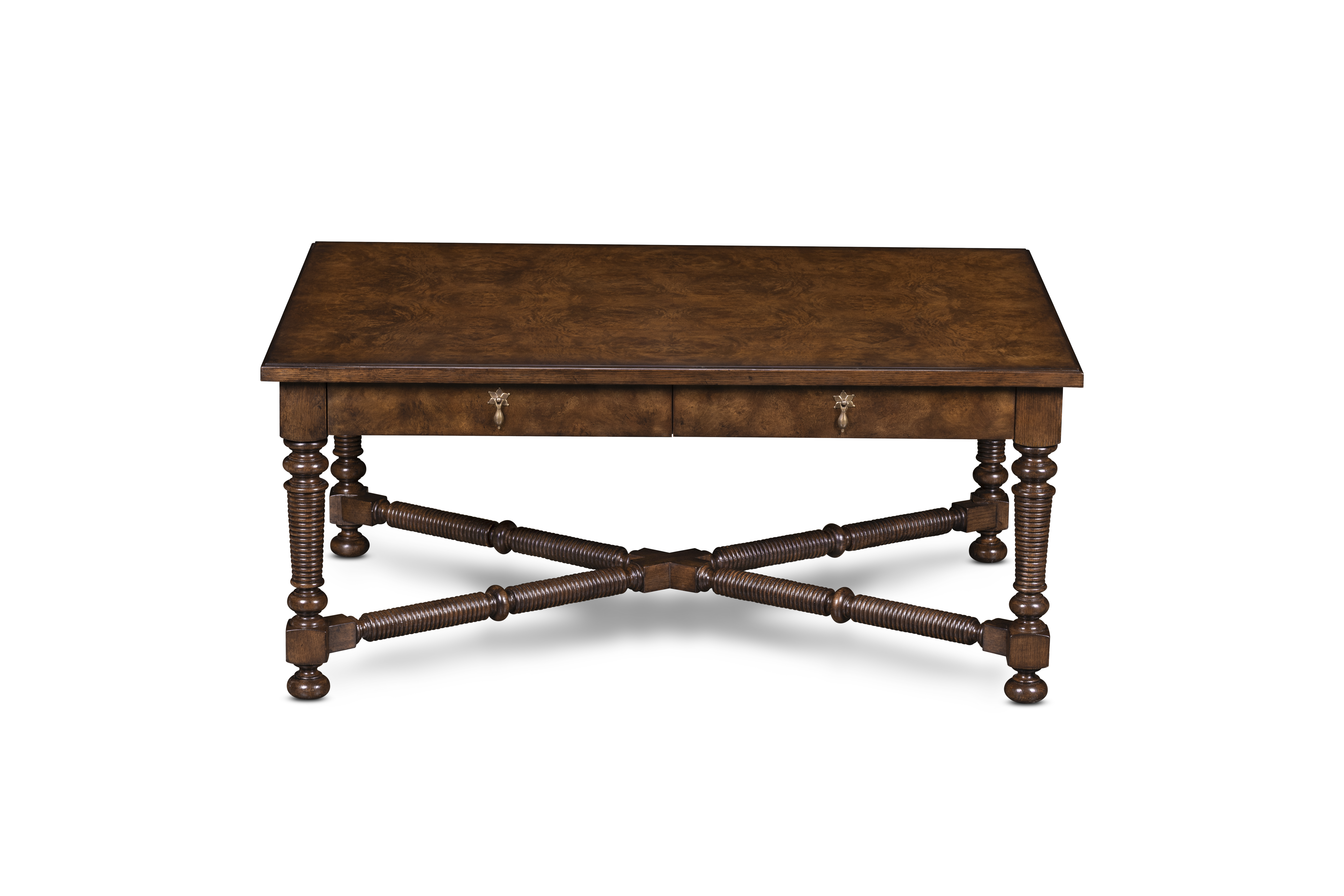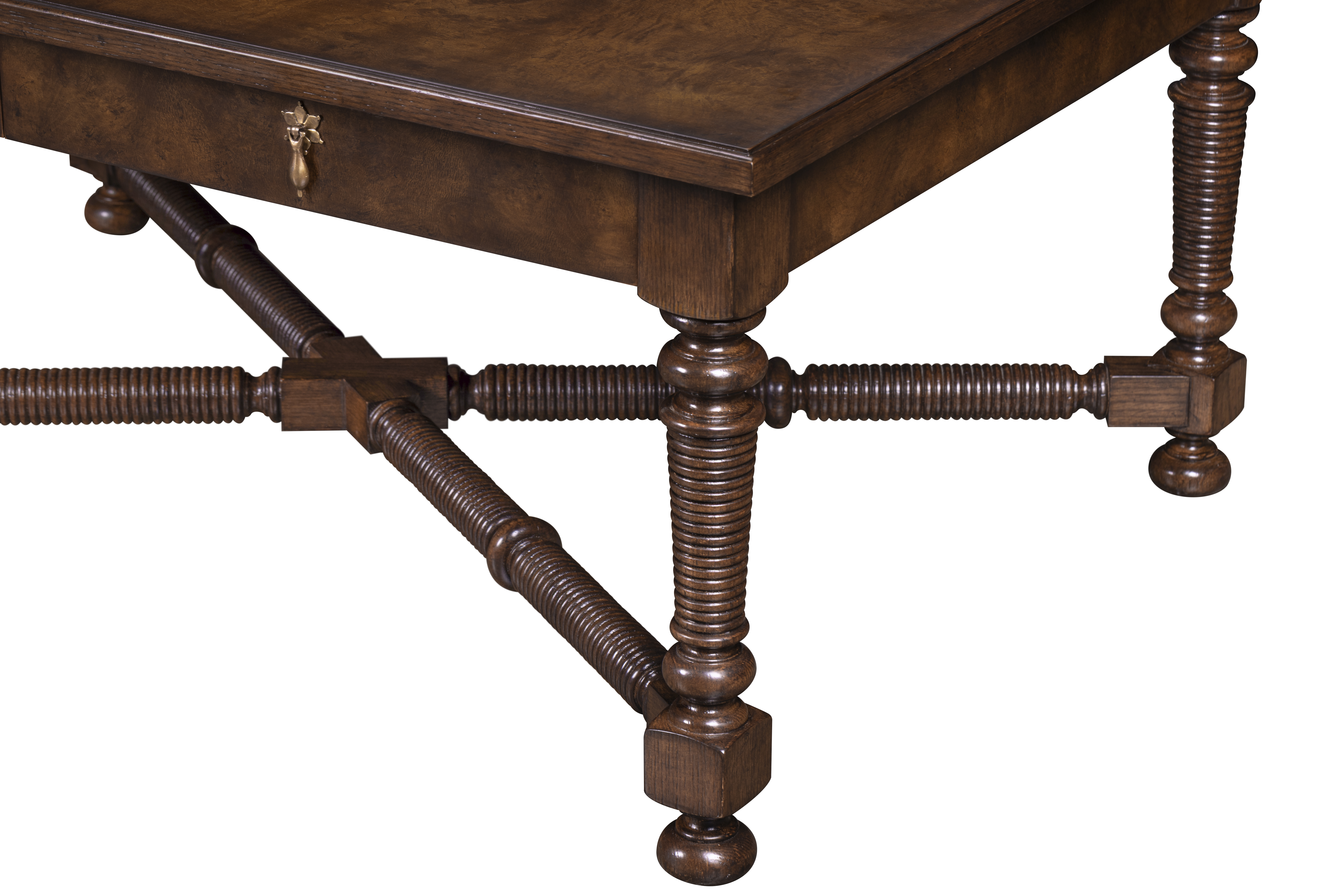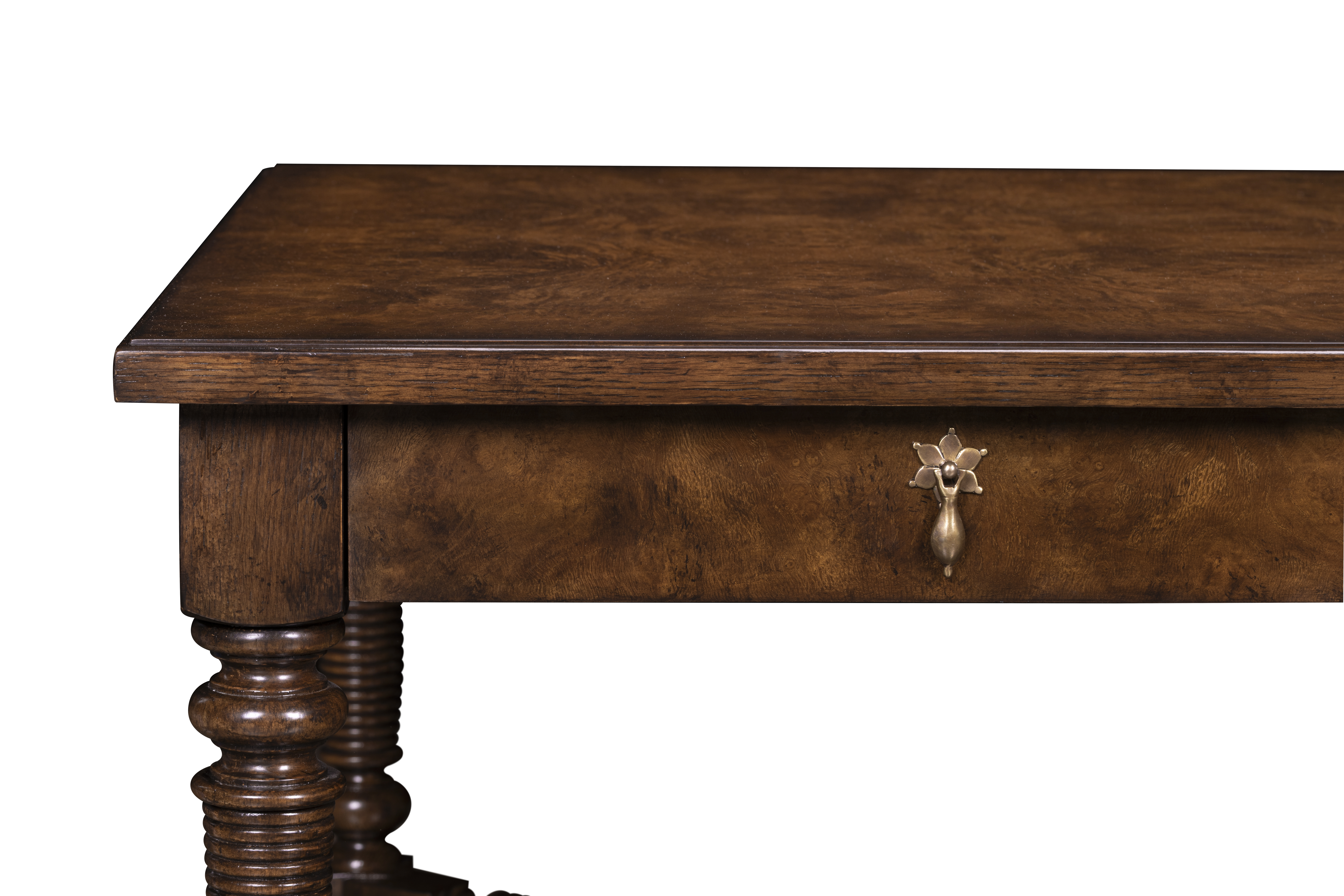 This hand-finished side table reflects devotion to artistry in form and detail. The richly grained oak burl top rests upon turned and ribbed legs joined by a sculptural stretcher—each element shaped and assembled by hand to evoke quiet grandeur. Four drawers with cast-brass pull adds both elegance and utility—an heirloom accent that marries craftsmanship and character.