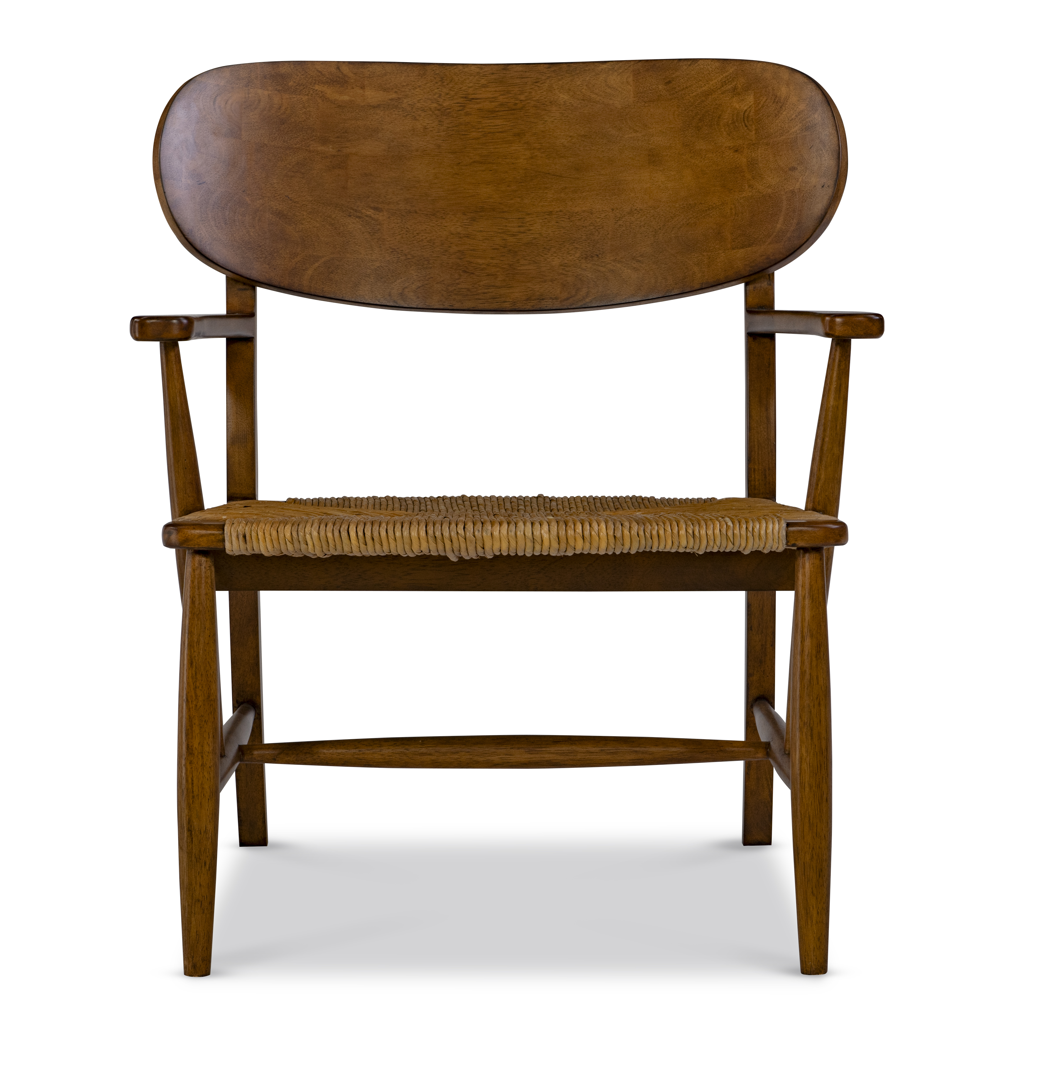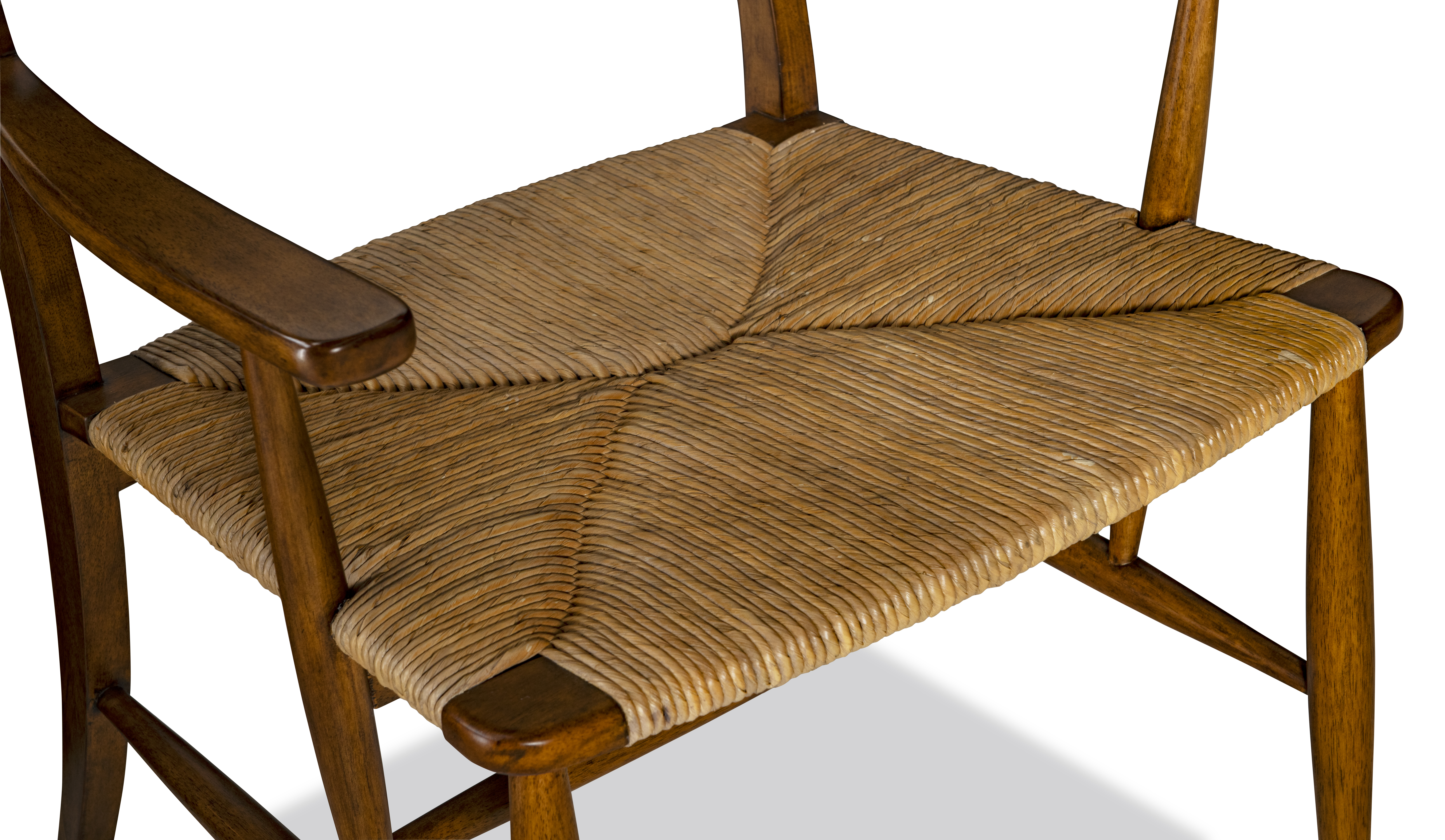 A beautifully proportioned bleached walnut armchair that blends rustic charm with refined craftsmanship. The sculpted wood frame and woven rush seat create a warm, tactile aesthetic that feels both relaxed and timeless. Its simplicity and craftsmanship nod to classic mid-century European design—an ethos often reflected in Maitland-Smith’s appreciation for artisanal detail.