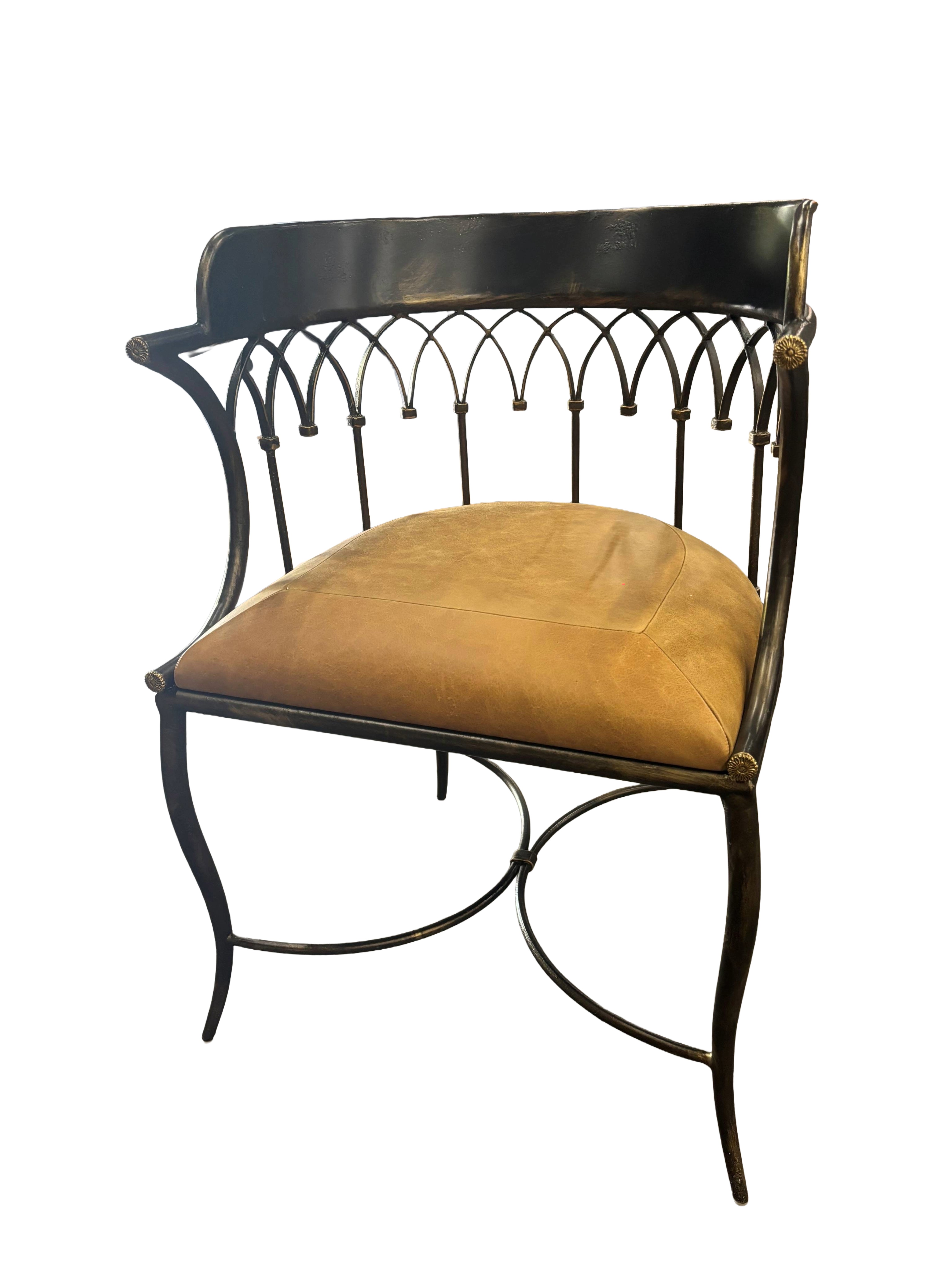 Pierre Accent Chair evokes the quiet strength of old-world craftsmanship, pairing hand-forged ironwork with a gently bowed leather back and tailored leather seat cushion. Subtle arched detailing and slender, sabre-inspired legs lend architectural structure, while the warm patina of the metal contrasts richly against the leather’s refined surface. Both sculptural and composed, the piece reflects Maitland-Smith’s enduring devotion to storied materials, disciplined artistry, and collected living.