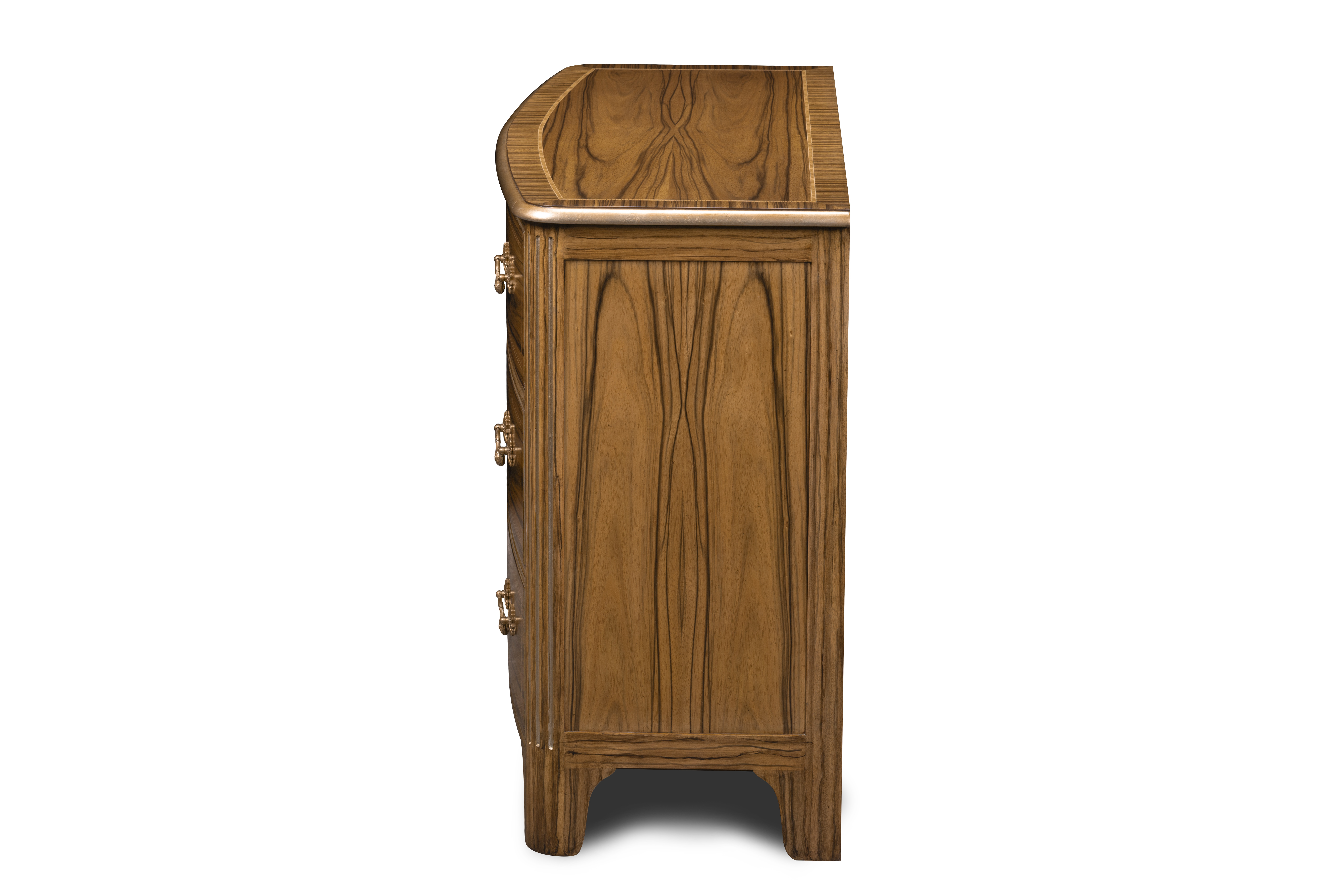 Graceful in form and rich in detail, this three-drawer chest showcases the artistry of matched veneers and fine craftsmanship. The flowing grain pattern is accentuated by delicate inlay and gilt-edge molding, while classic brass pulls add a note of timeless refinement. Subtly bowed and beautifully proportioned, it embodies Maitland-Smith’s signature harmony of elegance and craft.