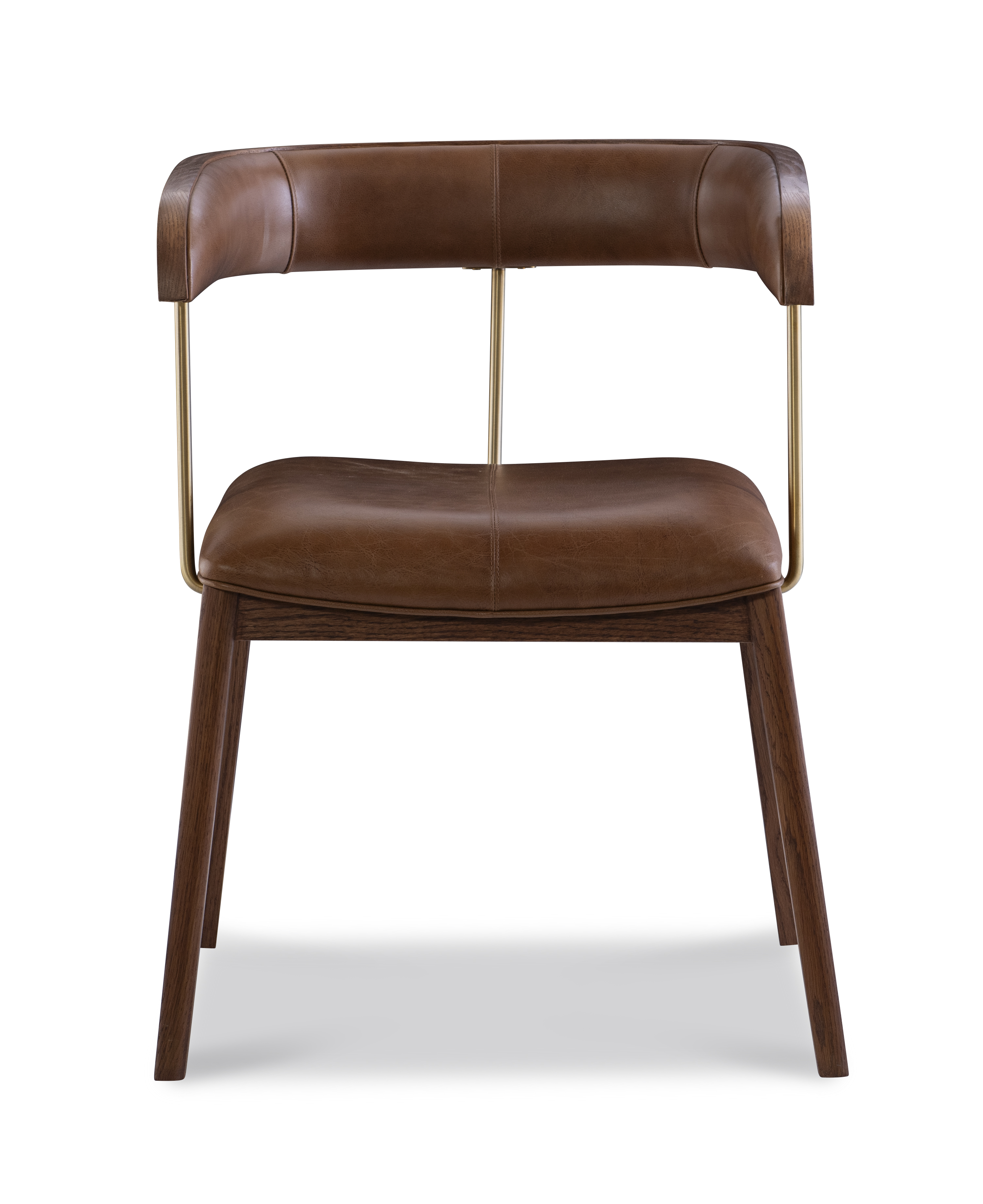 This curved-back leather armchair offers a refined blend of mid-century elegance and contemporary comfort. The softly contoured backrest wraps gently around the sitter, supported by slender brass rods that lend both strength and visual lightness. Upholstered in smooth tan leather and framed in warm wood, it’s a perfect balance of structure and softness.