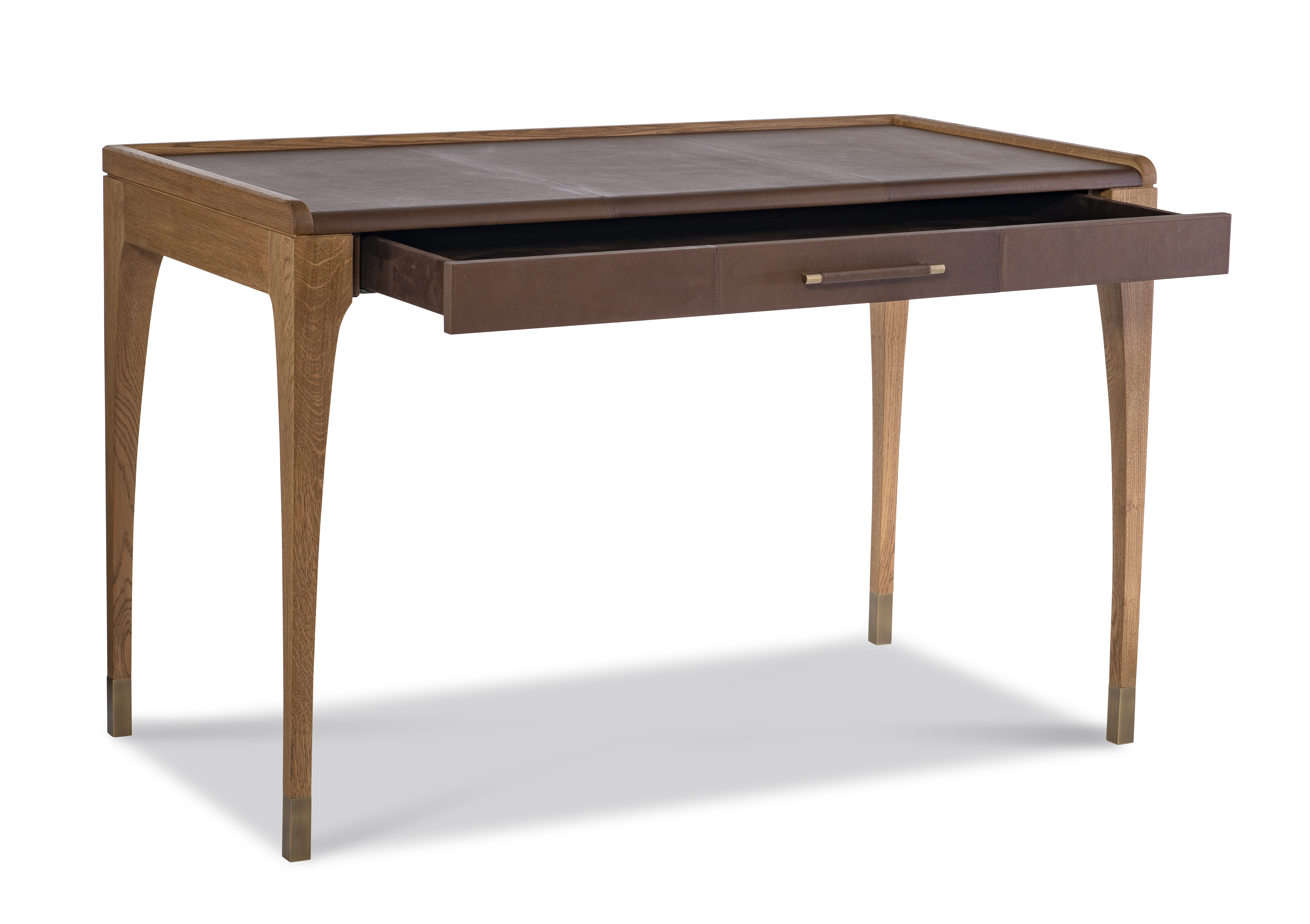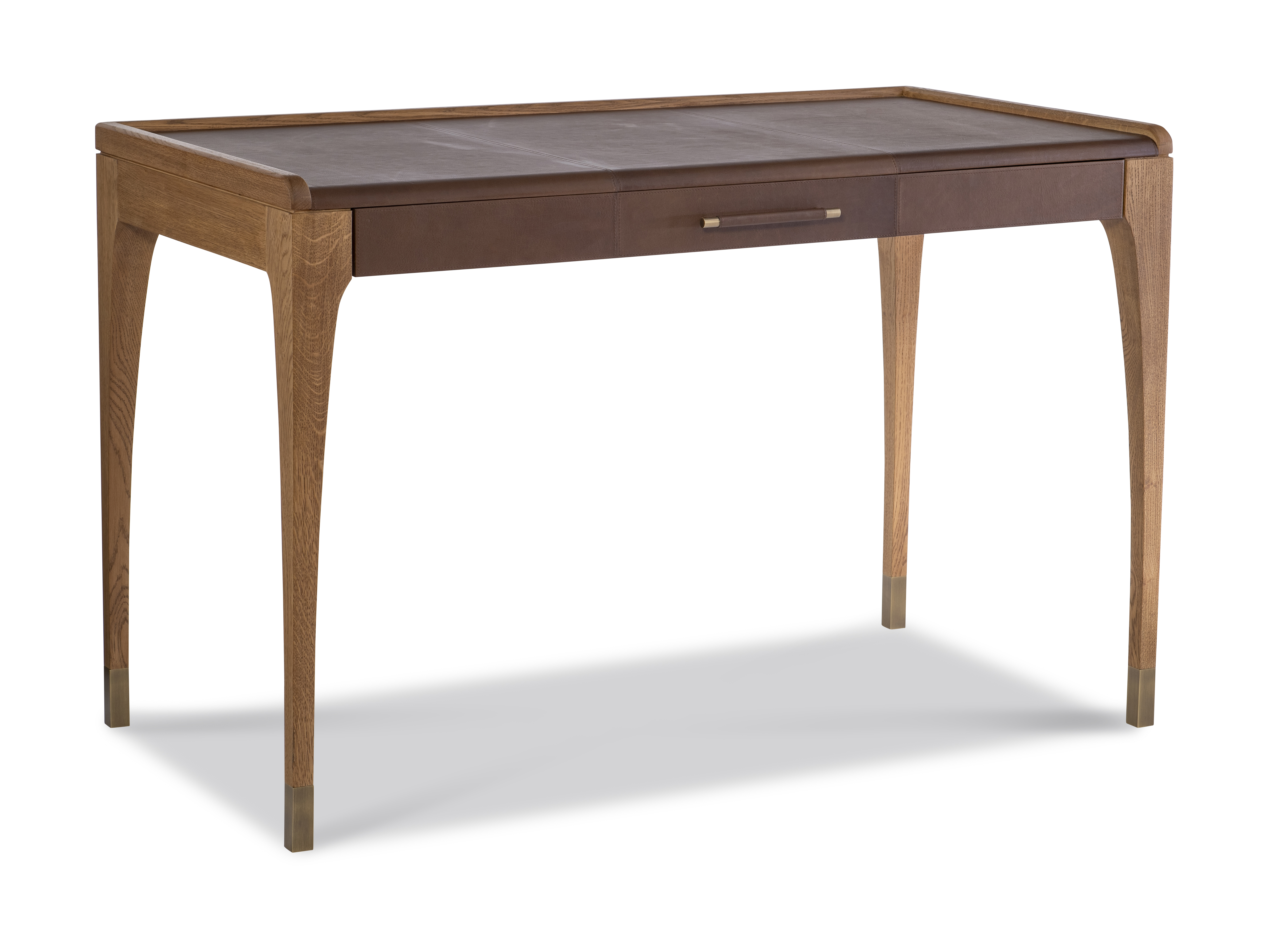 This leather-inset writing desk combines classic craftsmanship with a modern silhouette. The warm oak frame is paired with a supple leather top, offering both tactile richness and visual balance. Subtle brass accents on the drawer pull and leg caps lend a touch of sophistication, creating a versatile piece suited for refined home offices or boutique interiors.