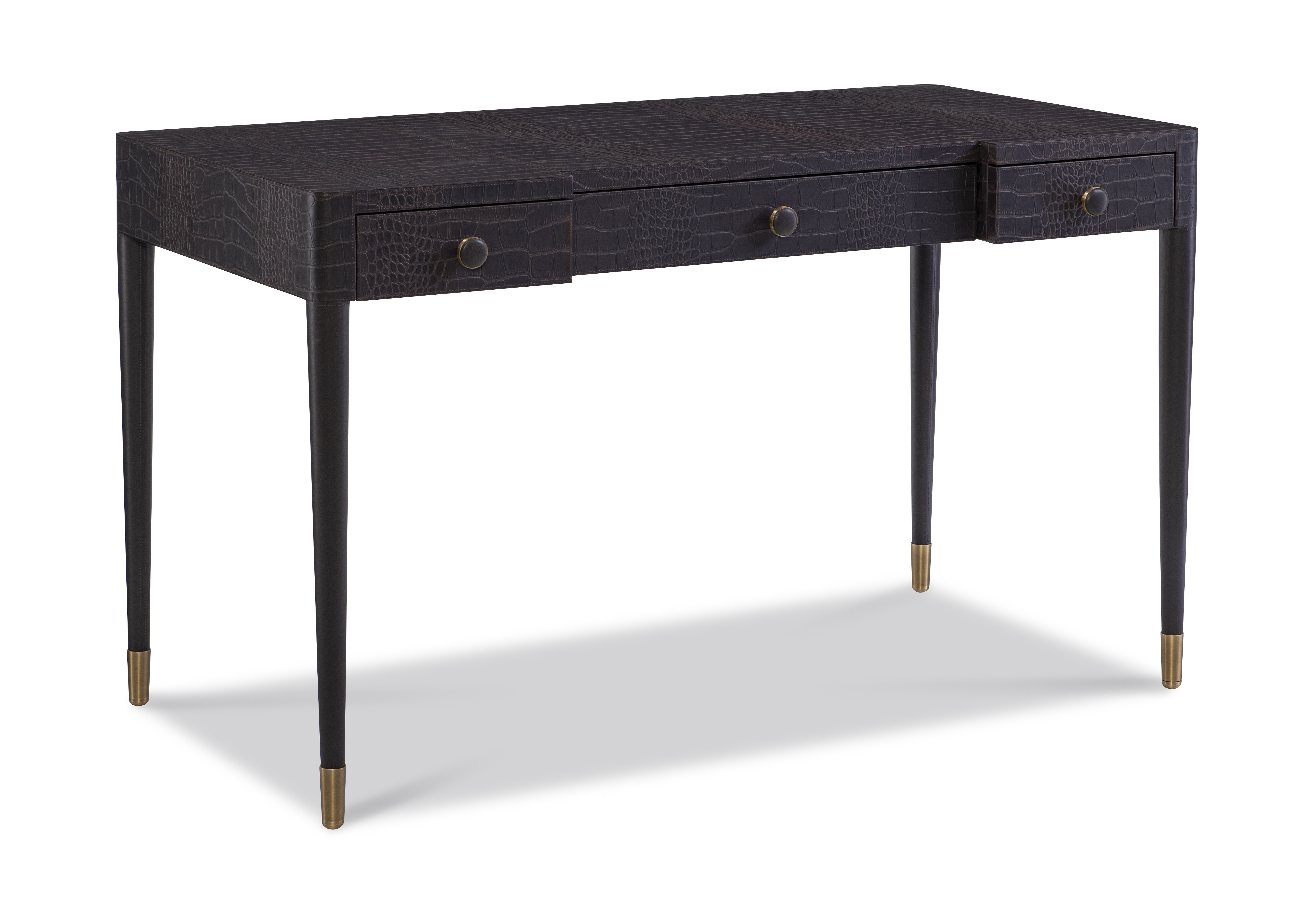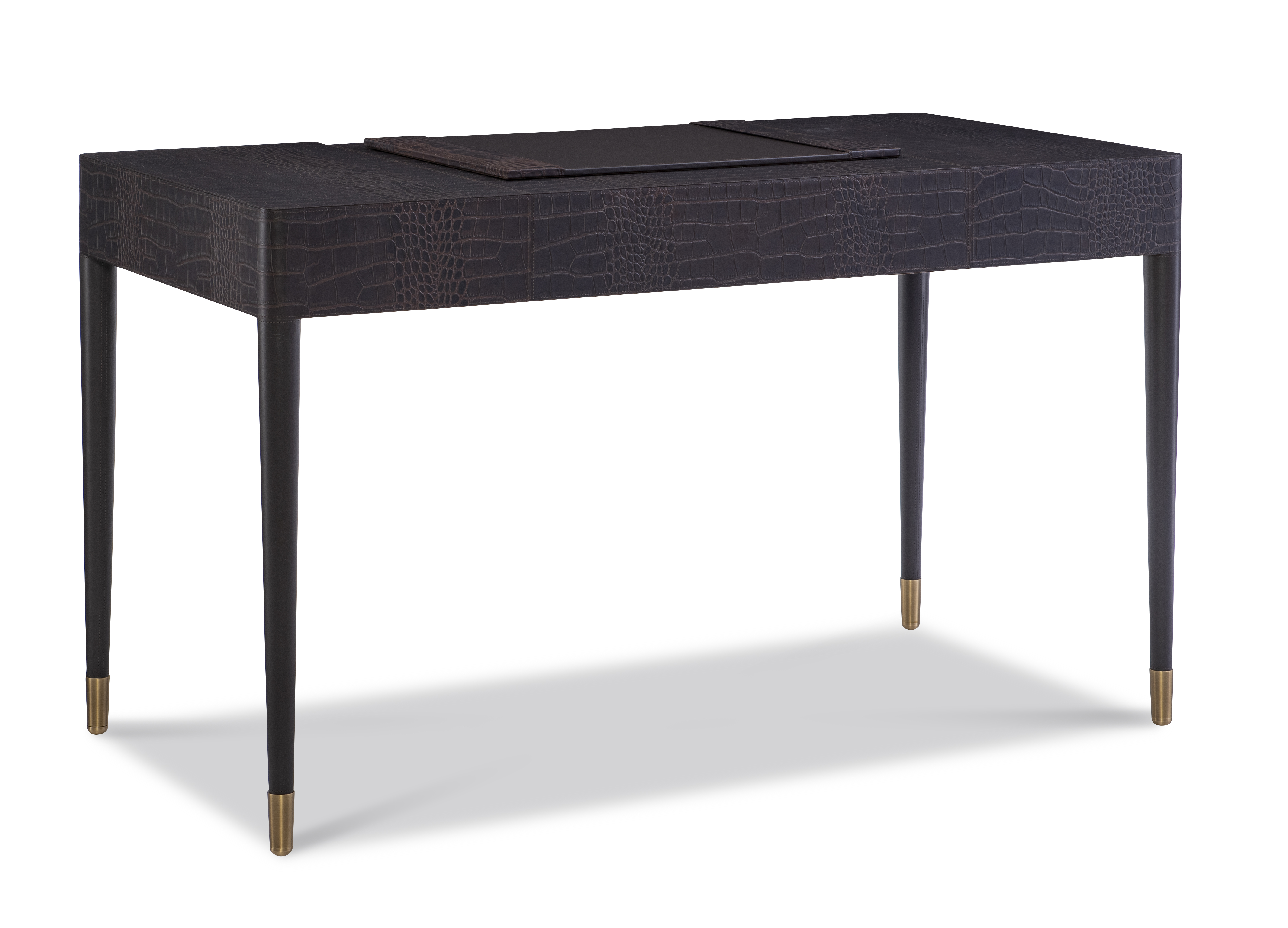 Tailored and tactile, this desk combines sleek form with luxurious texture. Wrapped in embossed leather with a crocodile motif, it rests on slender, tapered legs accented by polished brass caps and sculpted hardware.