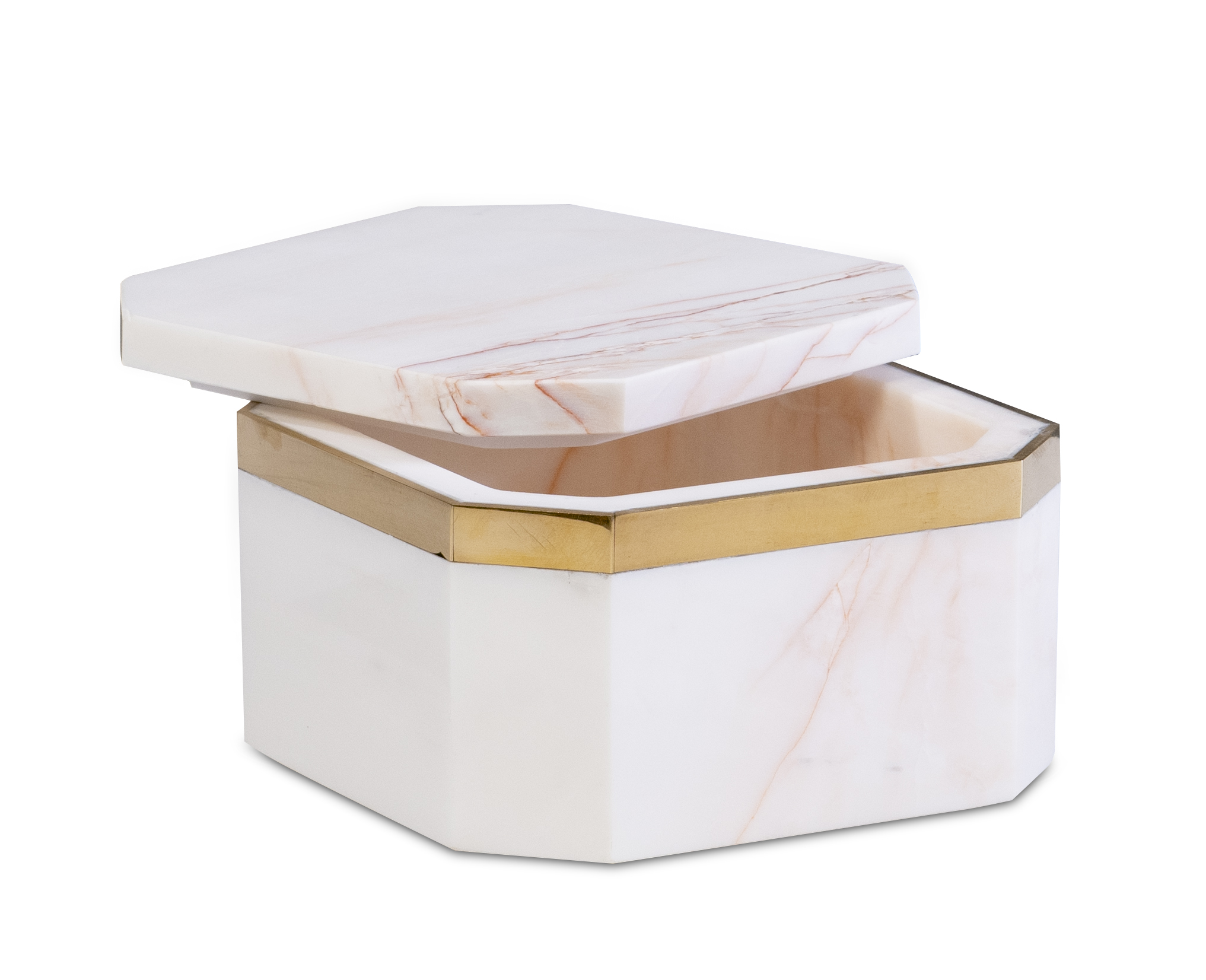 Carved from luminous white marble and encircled with a satin brass band, the Octavian Box embodies quiet strength and refined geometry. Its octagonal form recalls the symmetry of ancient temples and celestial charts, while the interplay of cool stone and warm metal creates a striking balance of texture and tone. Elegant in its restraint, this sculptural box offers a timeless resting place for treasured objects.