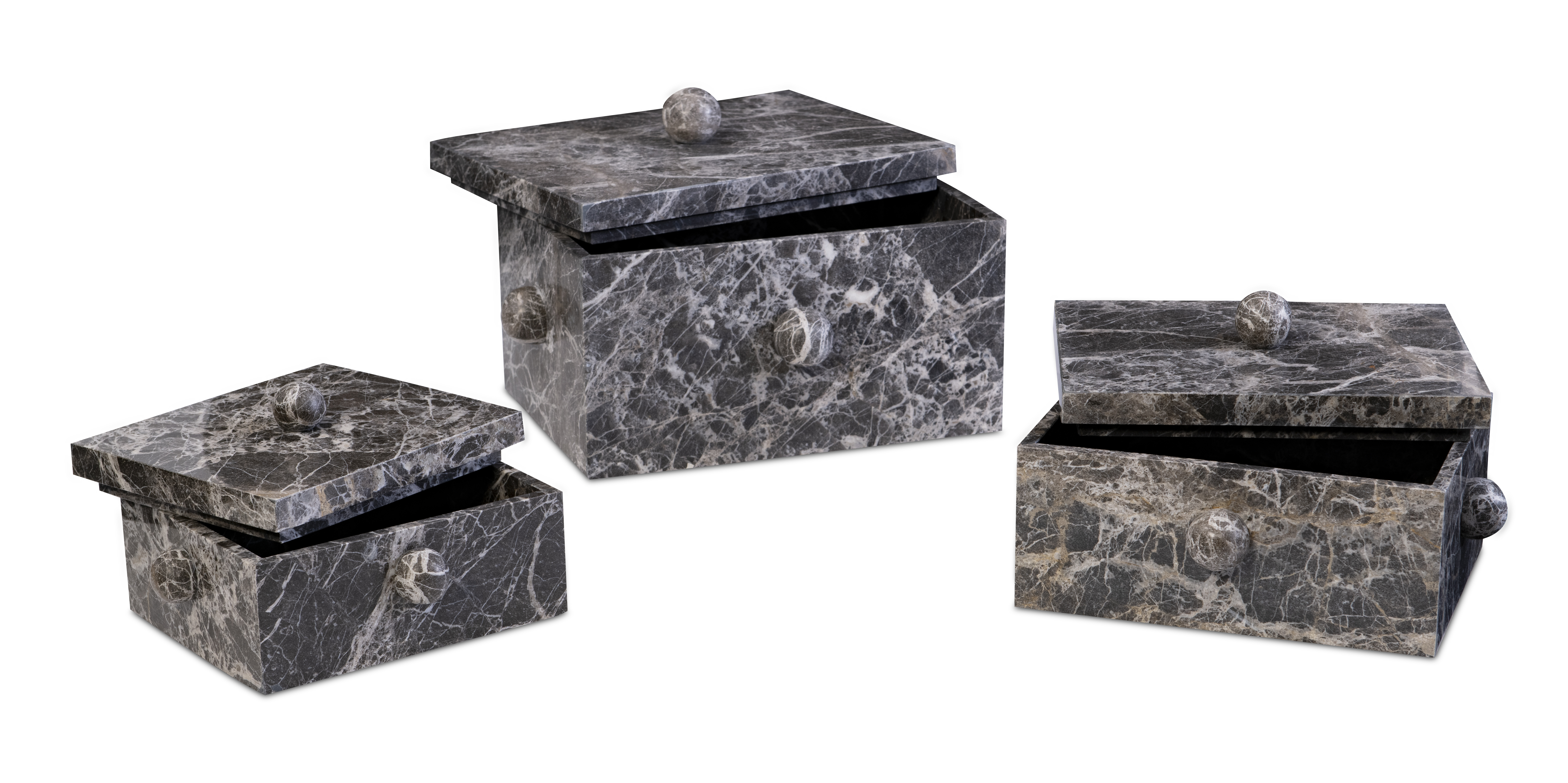 A study in proportion and texture, these nesting boxes are crafted from hand-finished stone composite with a soft, natural patina. Each piece is accented with a sculptural brass pull, lending a touch of understated opulence. Whether displayed as a trio or used individually, the collection evokes timeless elegance — a modern relic of form and function.