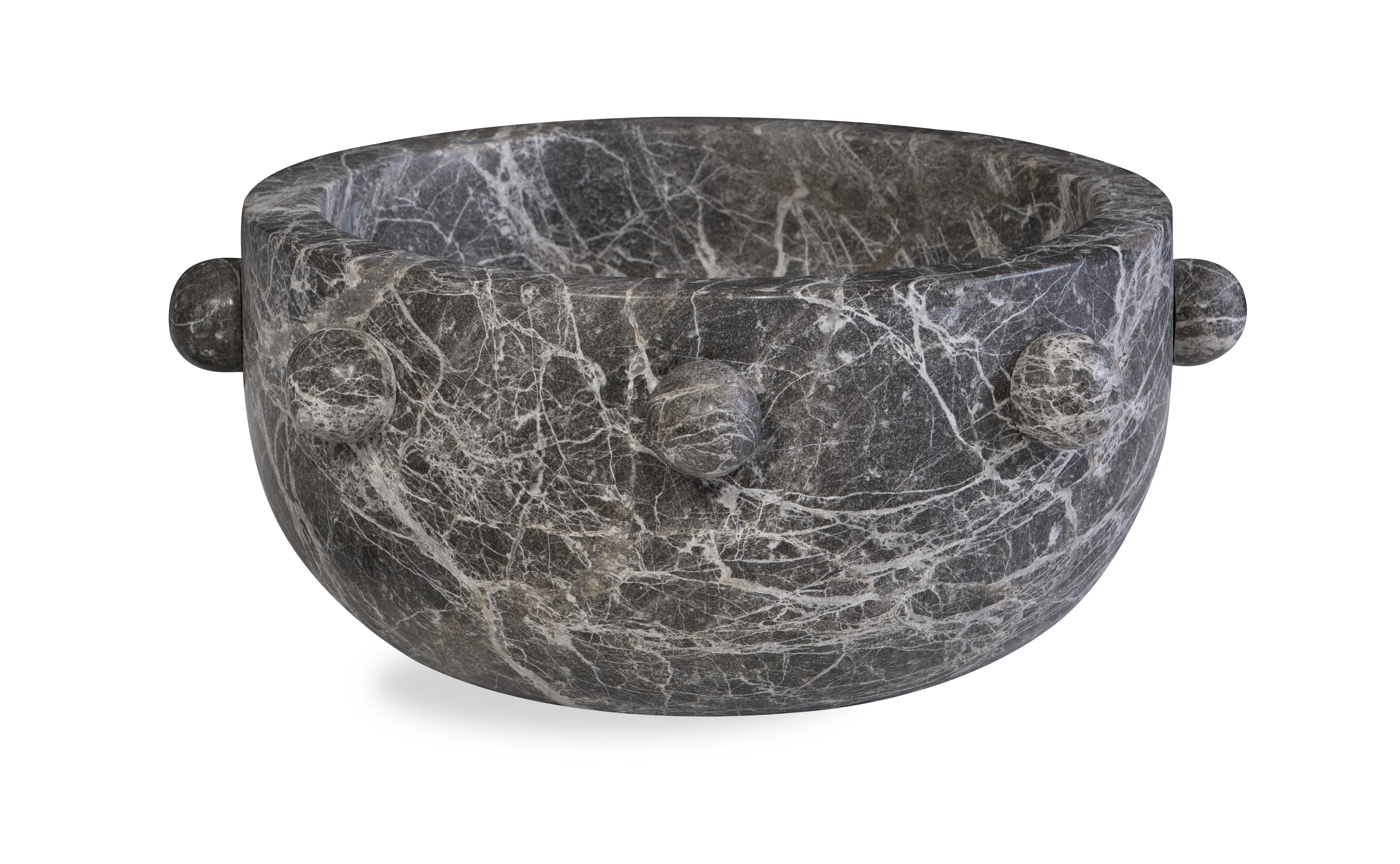Echoing the artifact-like beauty of ancient vessels, this rounded stone bowl is adorned with polished brass studs that catch the light like scattered relics. The juxtaposition of its hand-textured surface and refined metallic accents evokes a sense of timeless craftsmanship — a modern ode to the ceremonial forms of antiquity. Both decorative and functional, it serves as a striking centerpiece or sculptural catchall.