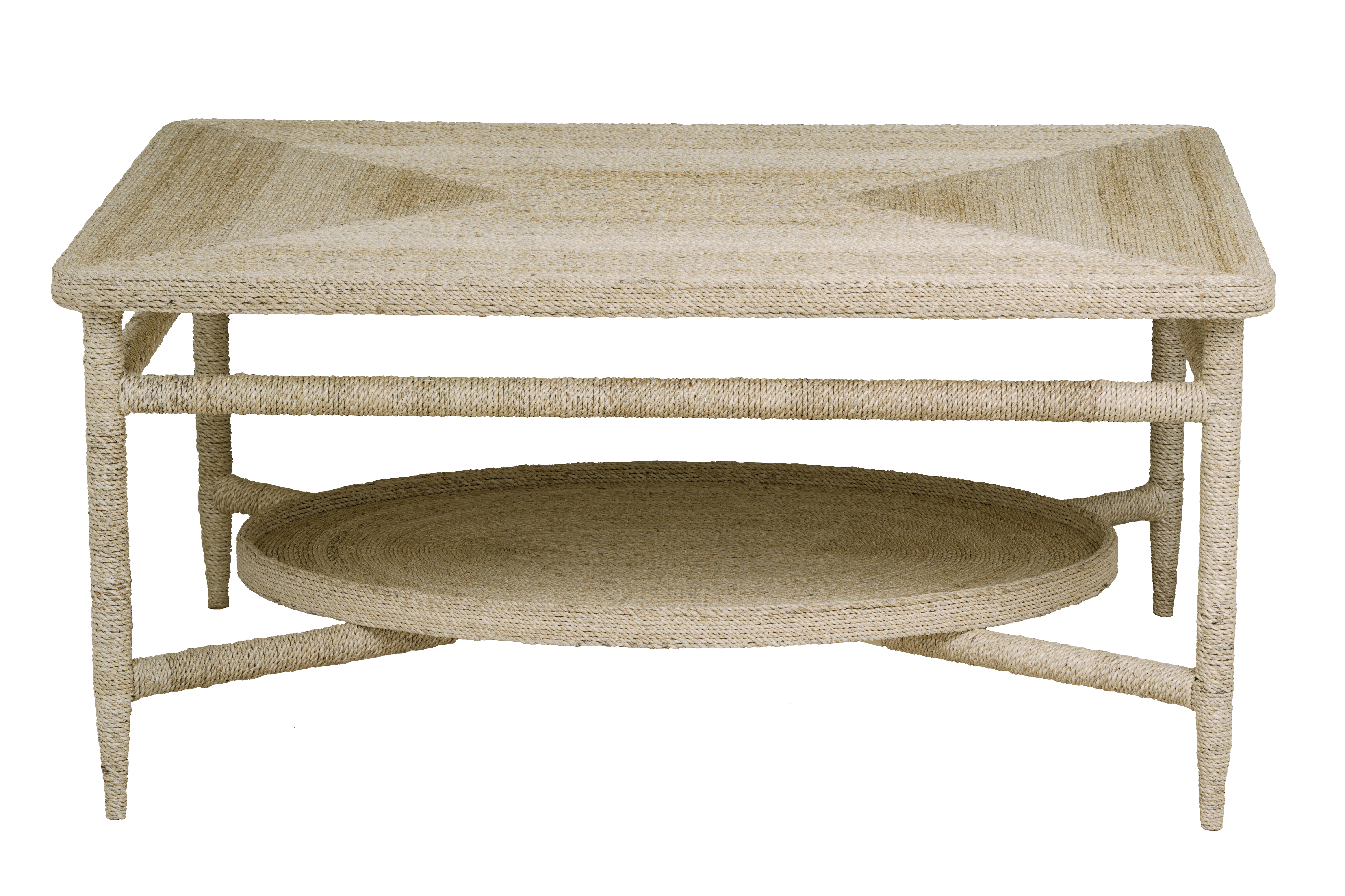 Natural Abaca wrapped rectangular cocktail table with oval gallery-edged shelf.