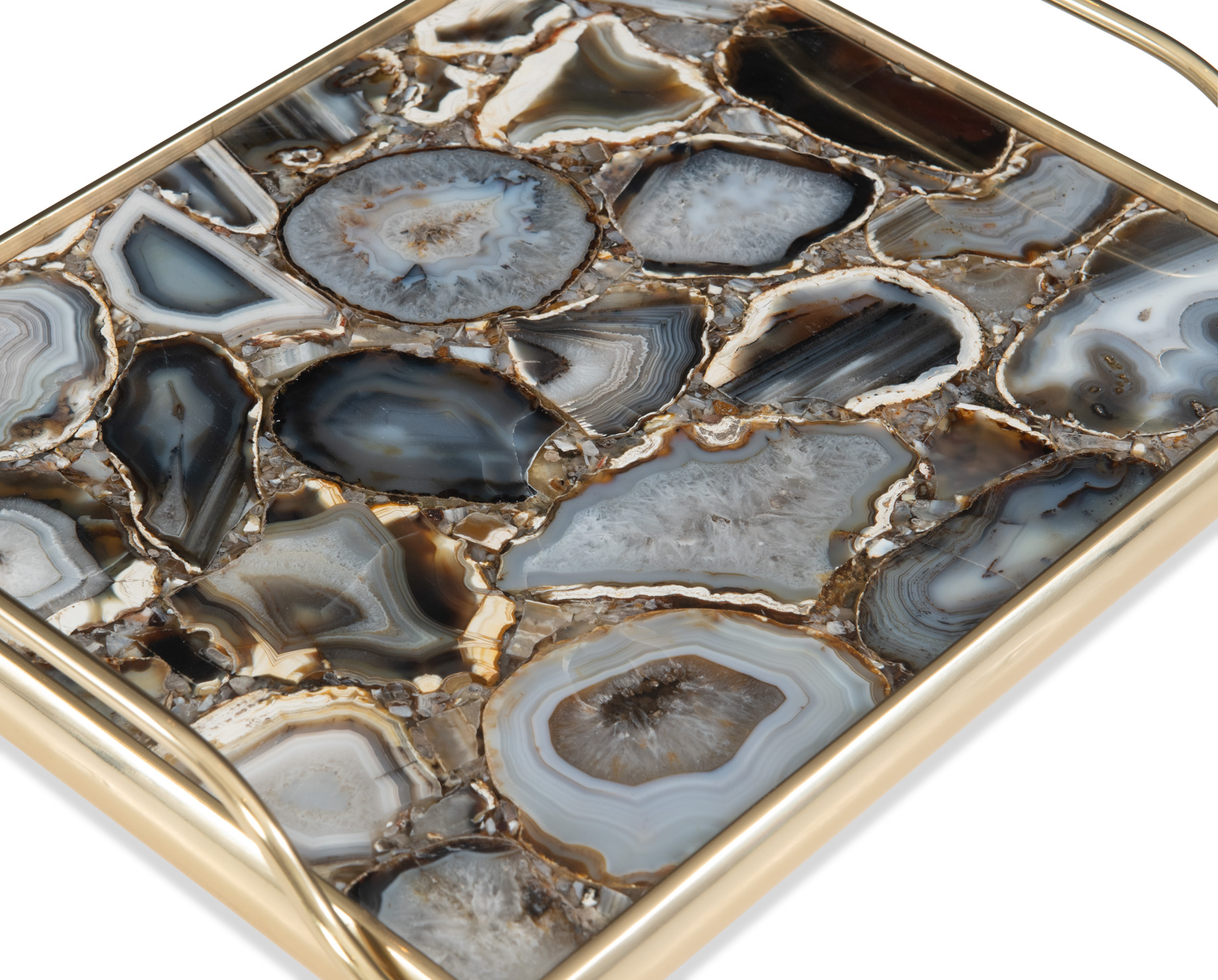 Polished brass and black agate tray. Black agate is a natural stone and some variation of the pattern is a characteristic of the material.