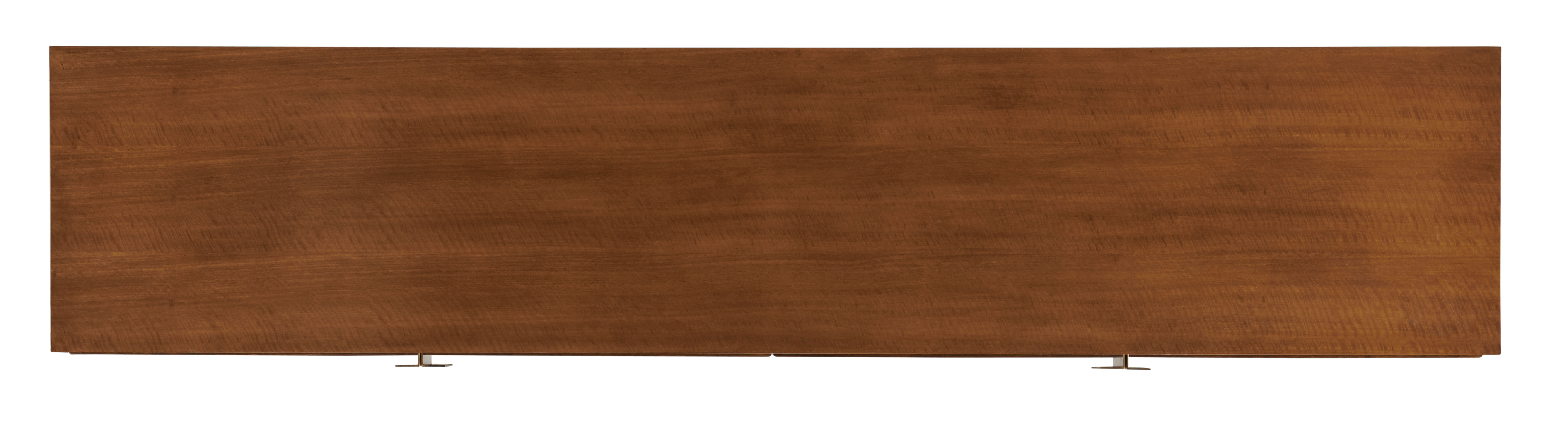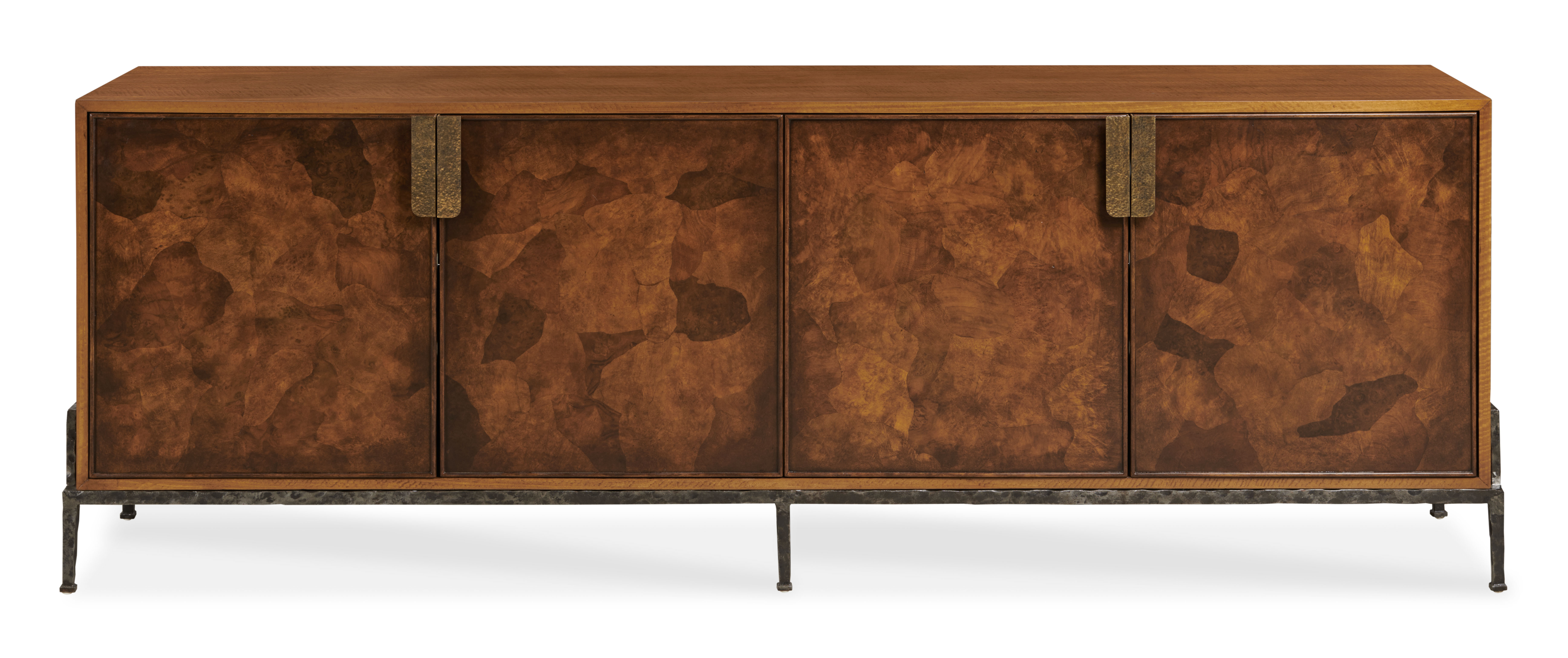 Large credenza featuring crazy cut walnut swirl cabinet fronts set atop a medium forged iron base. Hammered bronze door pulls add decoration and texture to this rugged beauty. Cord management holes included.