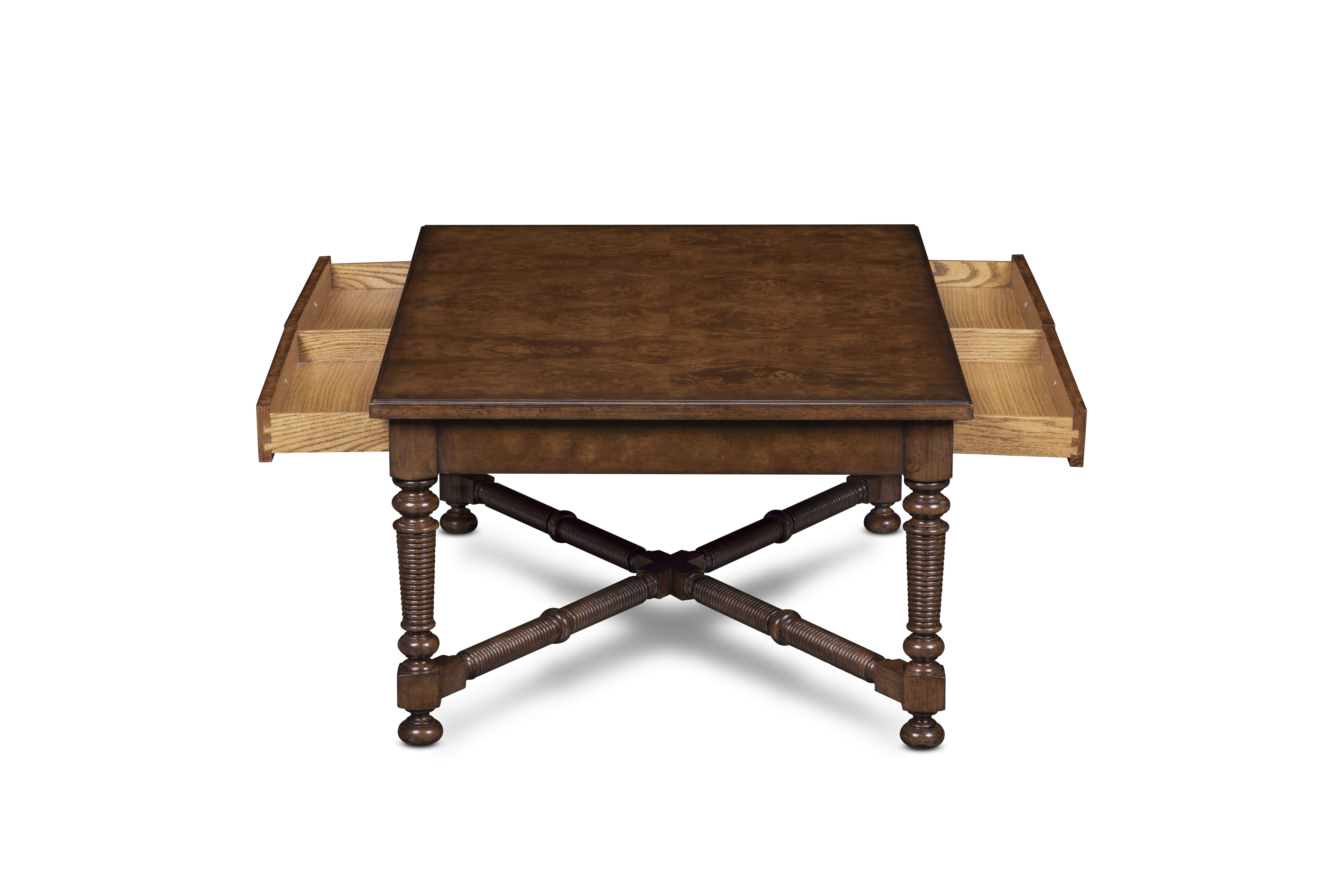 This hand-finished side table reflects devotion to artistry in form and detail. The richly grained oak burl top rests upon turned and ribbed legs joined by a sculptural stretcher—each element shaped and assembled by hand to evoke quiet grandeur. Four drawers with cast-brass pull adds both elegance and utility—an heirloom accent that marries craftsmanship and character.