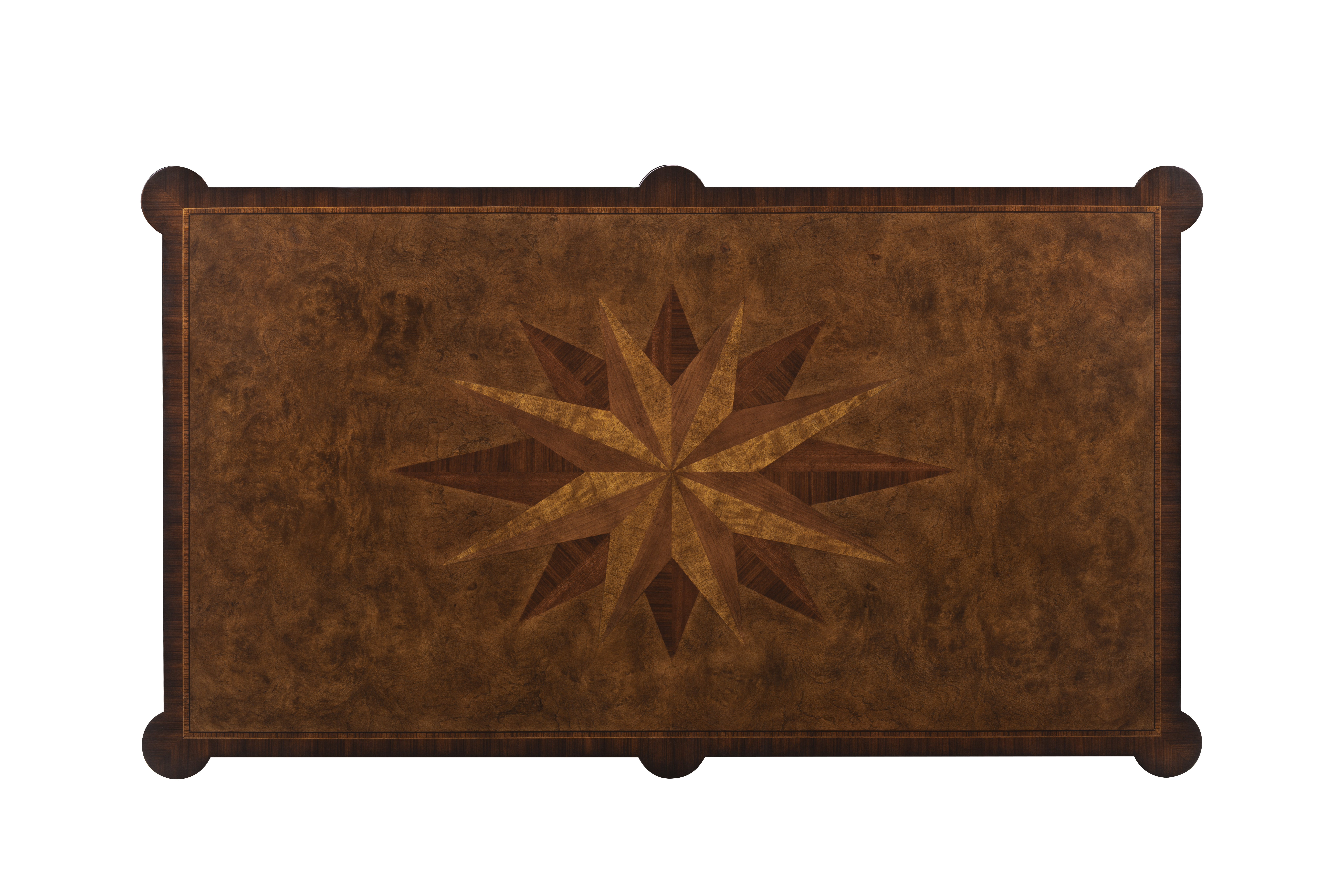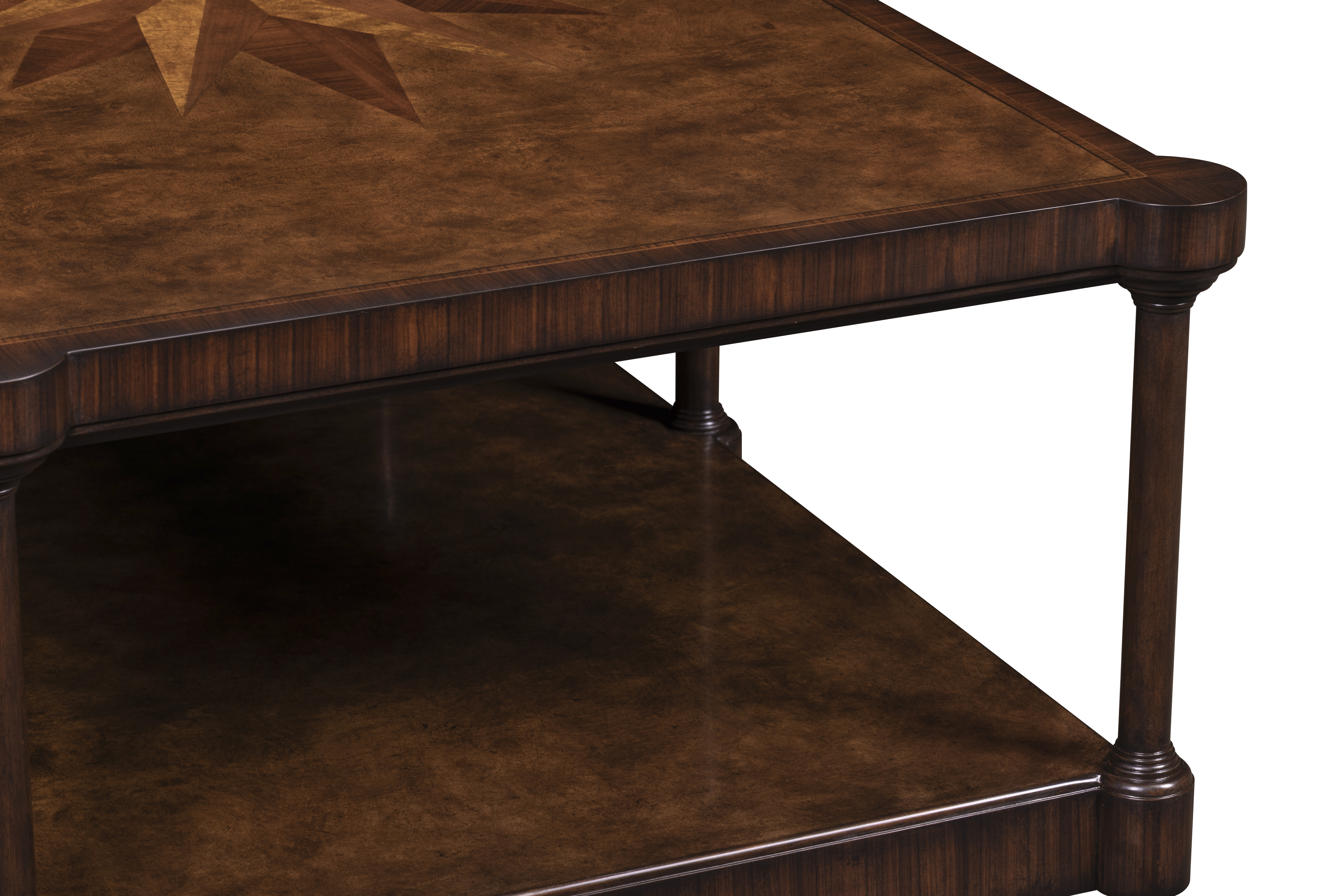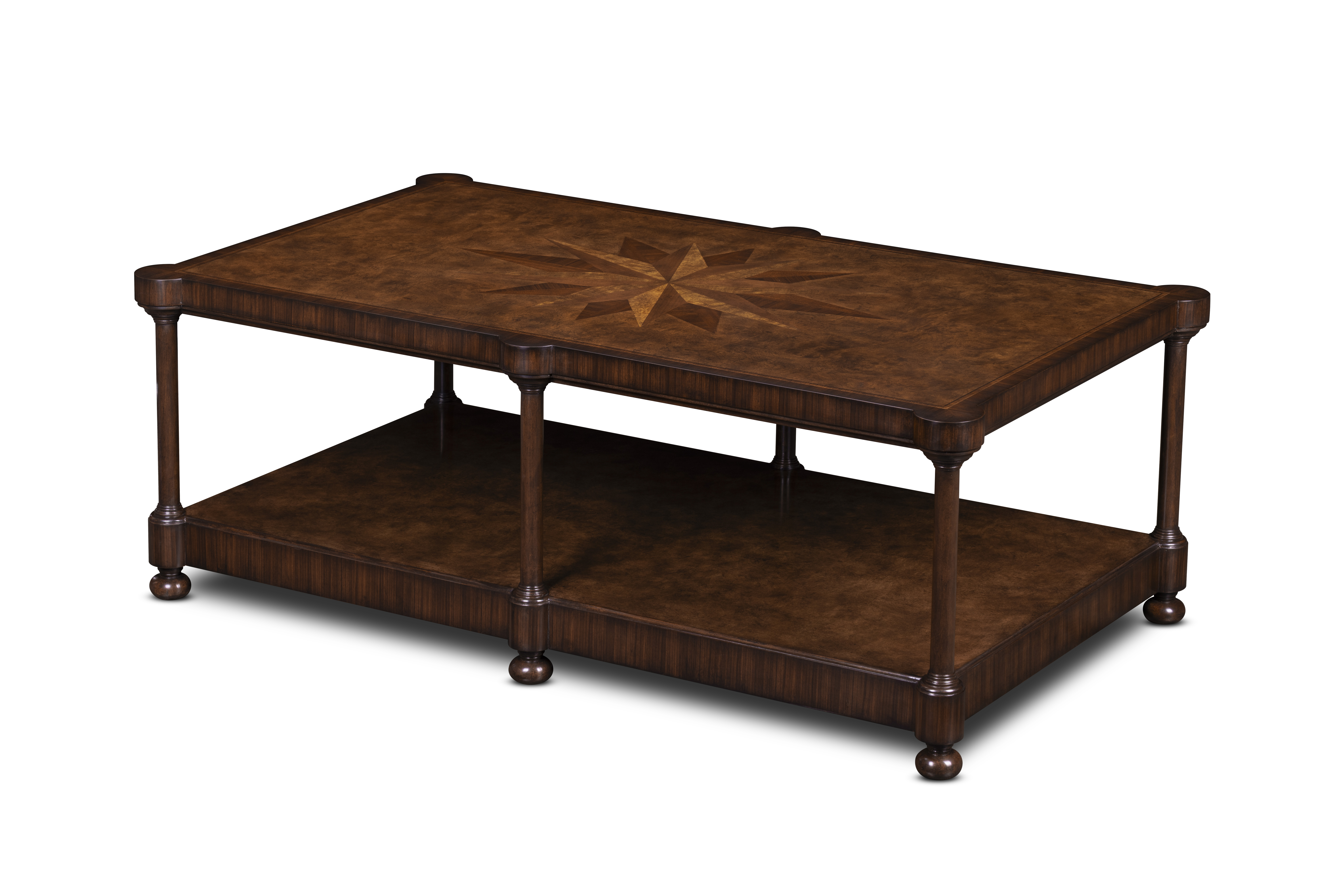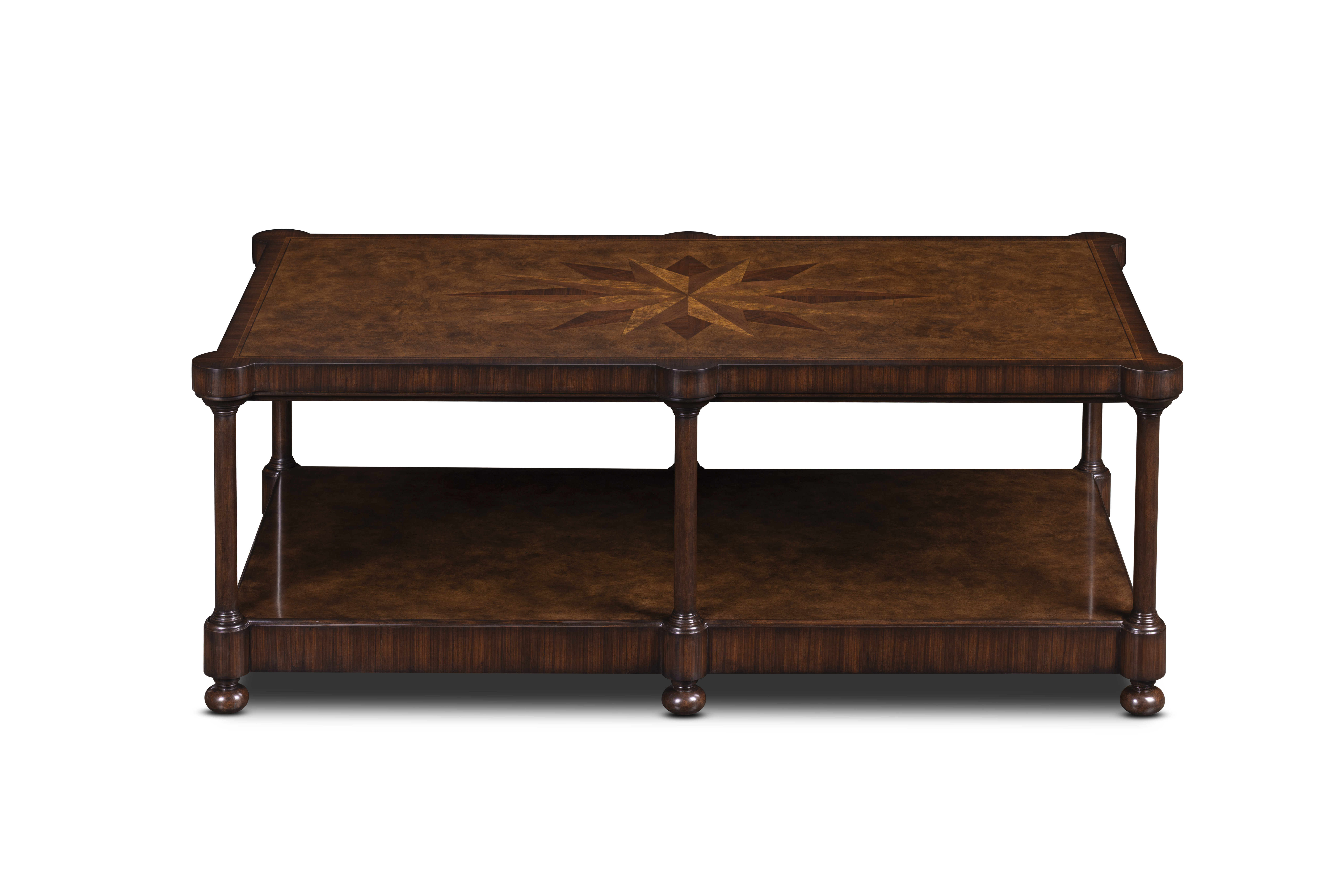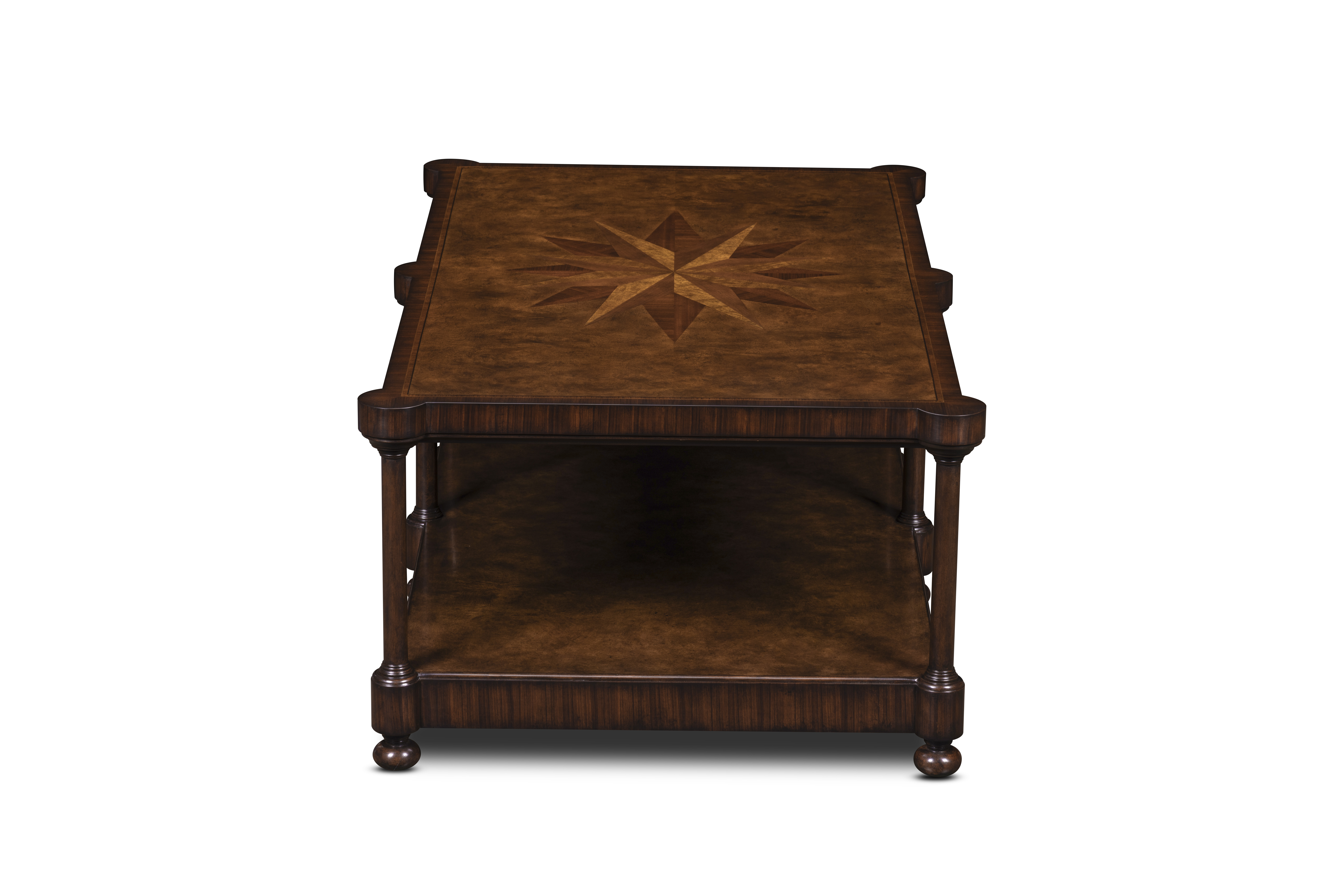 A study in proportion and craftsmanship, this rectangular cocktail table showcases the artistry of hand-matched veneers and traditional joinery. The tabletop’s inlaid starburst motif radiates from the center, drawing the eye to its finely balanced geometry. Supported by turned legs and finished with a lower shelf for display or storage.
