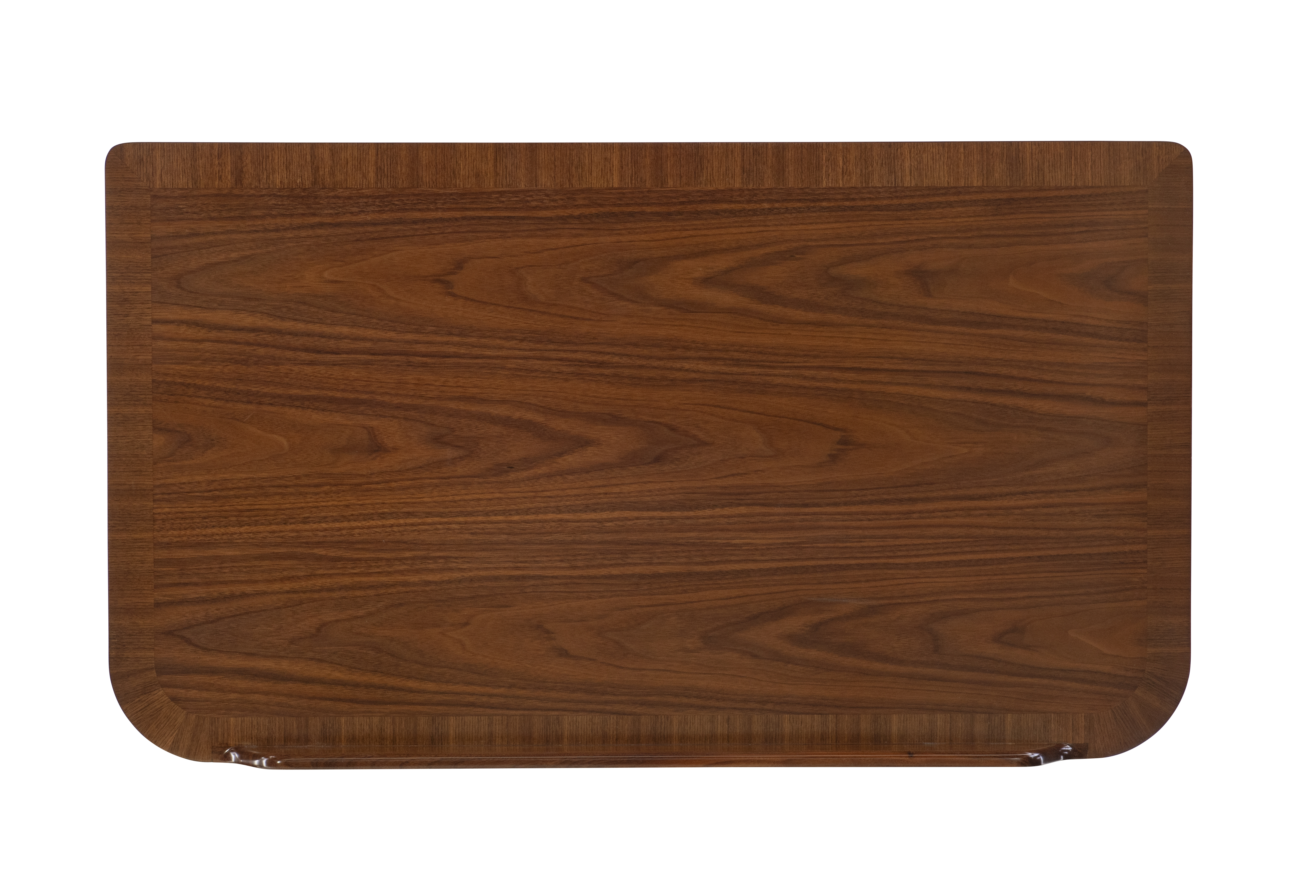 Elegant and understated, this writing desk pairs clean modern lines with classic craftsmanship. The rich walnut veneer surface and softly rounded corners create a refined silhouette, while brass-capped legs and subtle inlay detailing add a touch of timeless sophistication.