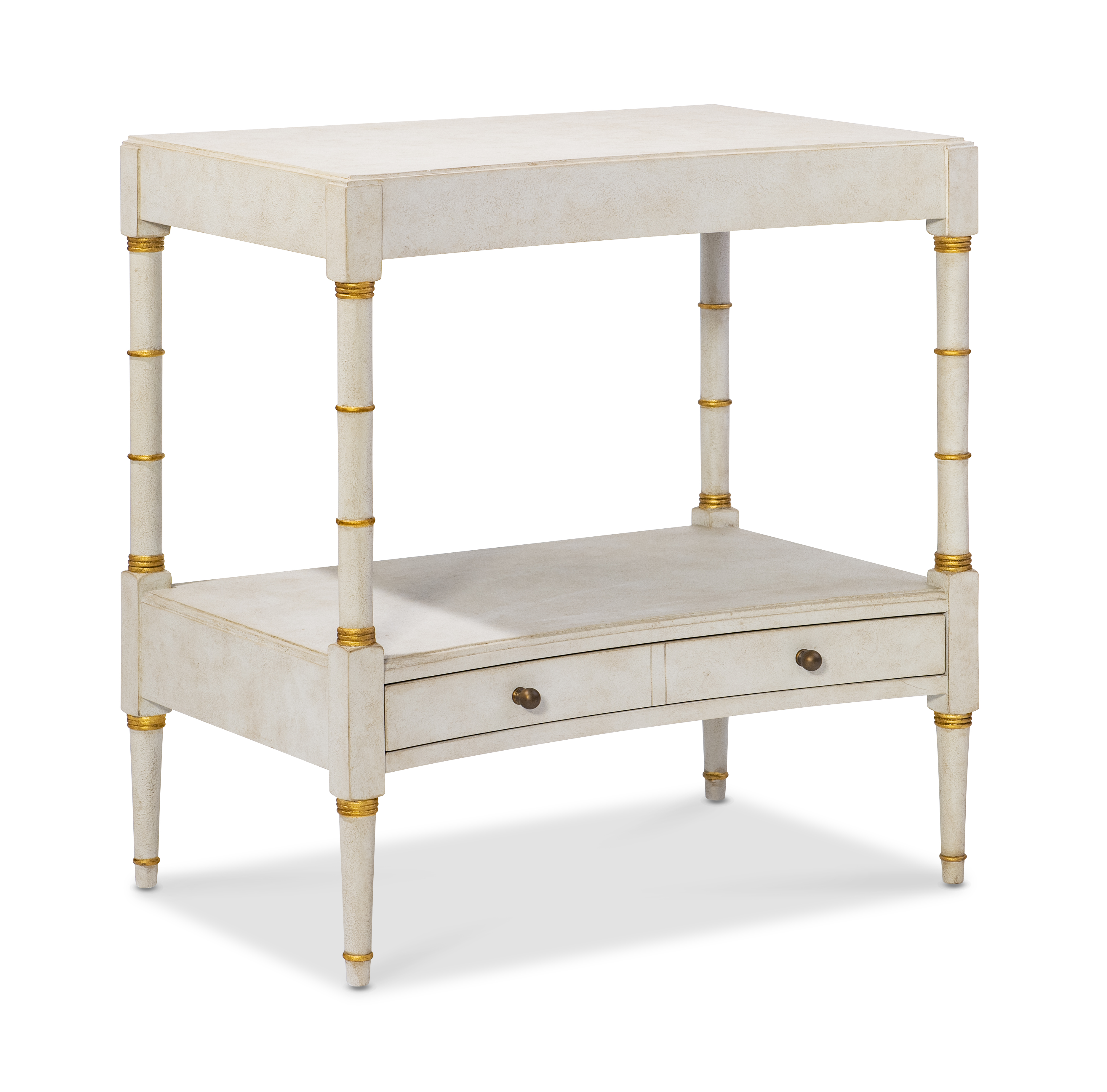 A graceful accent piece that blends neoclassical inspiration with modern refinement. This two-tier table features a soft French ivory finish, elegantly tapered legs, and subtle gold ring detailing. Its curved lower drawer front adds a touch of sophistication, echoing our legacy of handcrafted luxury with a contemporary sensibility.