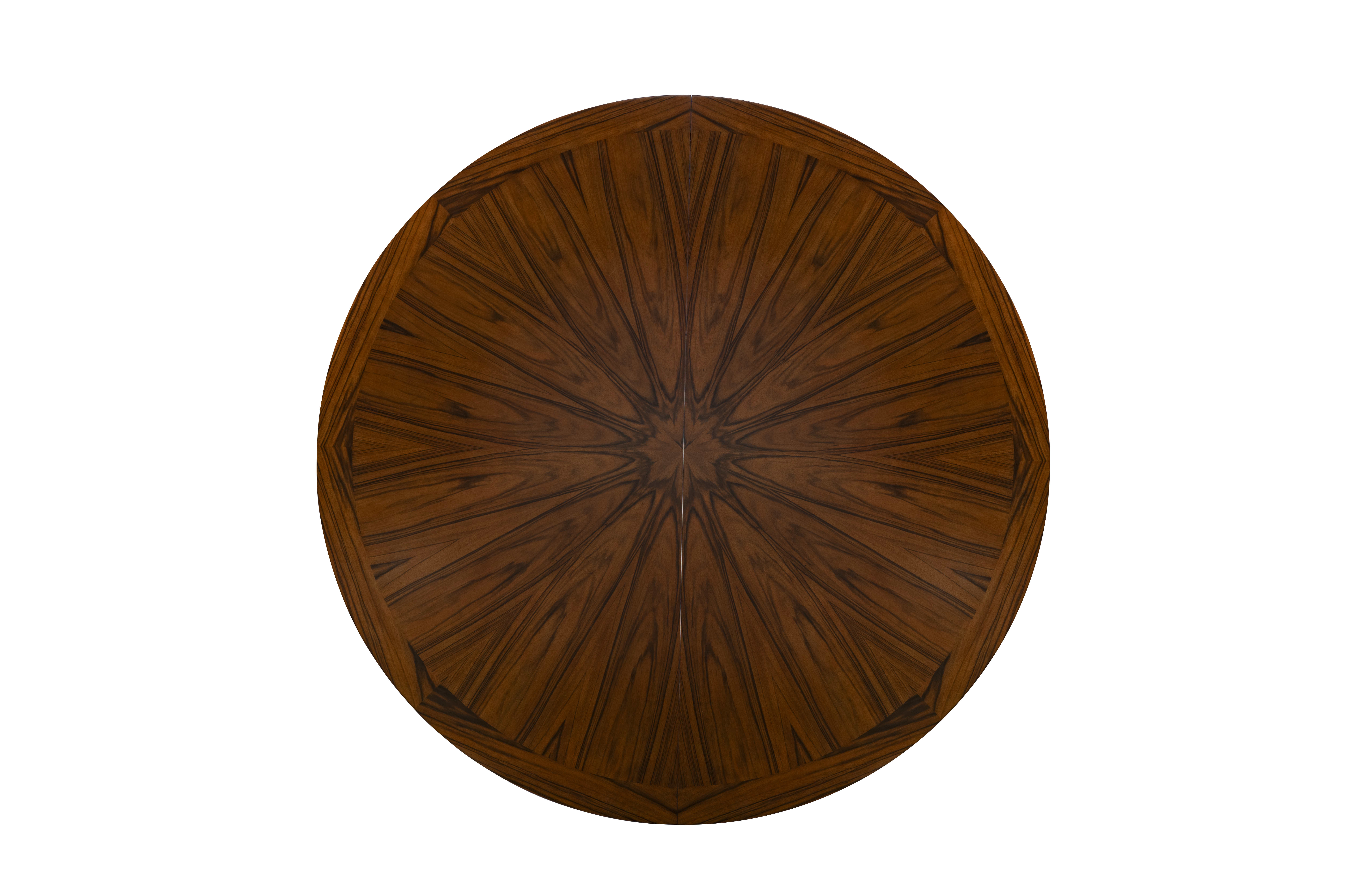 An exquisite dining table that celebrates artistry in wood craftsmanship. The Paldao wood top showcases a dramatic sunburst veneer pattern radiating from the center, perfectly balanced by a pair of sculptural cabriole-style pedestal bases. This piece embodies our devotion to intricate detail and timeless form, offering a modern take on classic elegance. Table includes one 22" center leaf, bringing the maximum possible width to 72 inches.