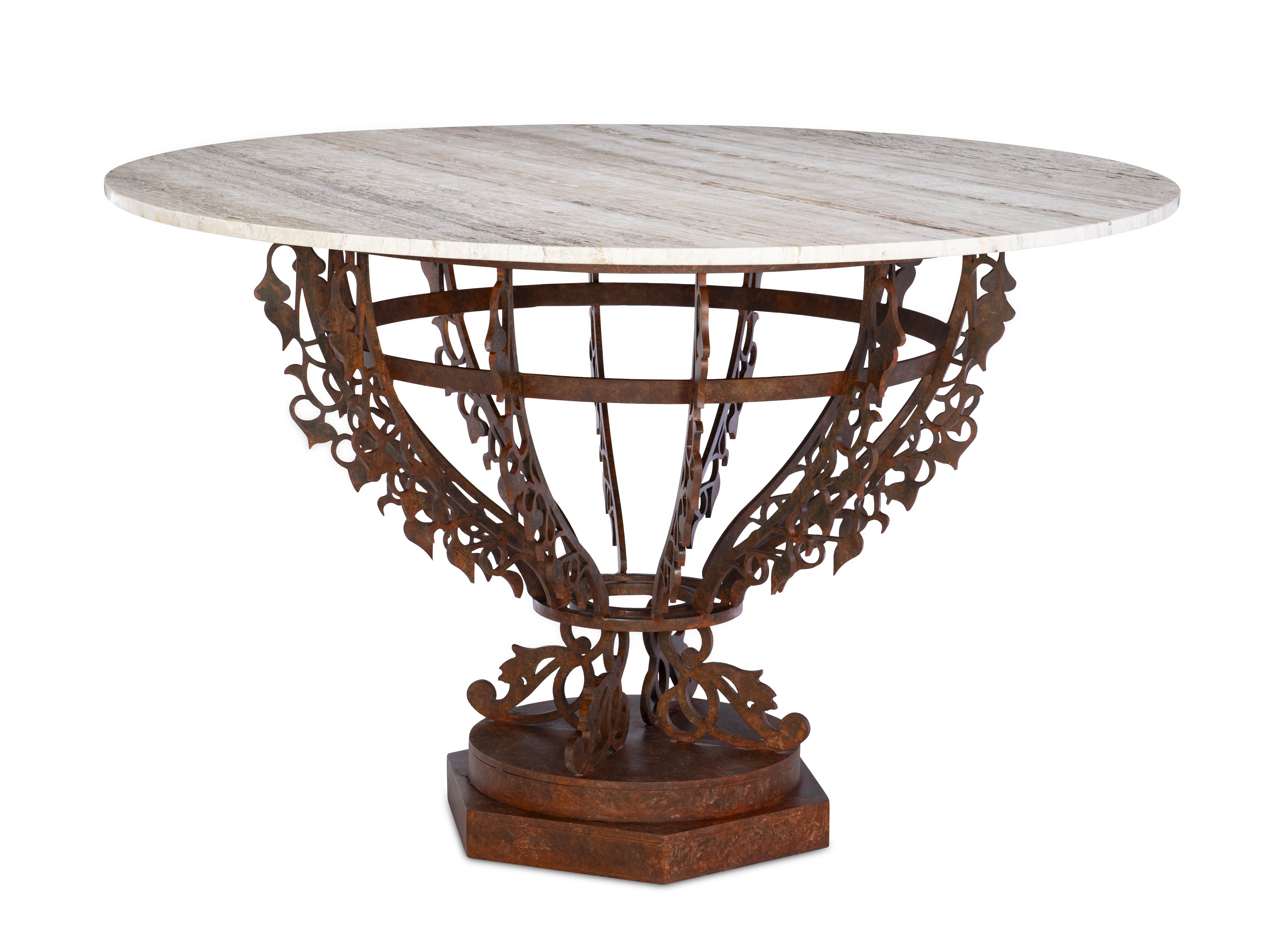 A captivating balance of strength and artistry, this remarkable center table pairs a sculptural, hand-forged metal base with a beautifully honed Italian travertine top. The warm, organic texture of the stone complements the patinated metalwork below, creating a piece that feels both grounded and gracefully refined—an enduring expression of Maitland-Smith’s artistry and material mastery.