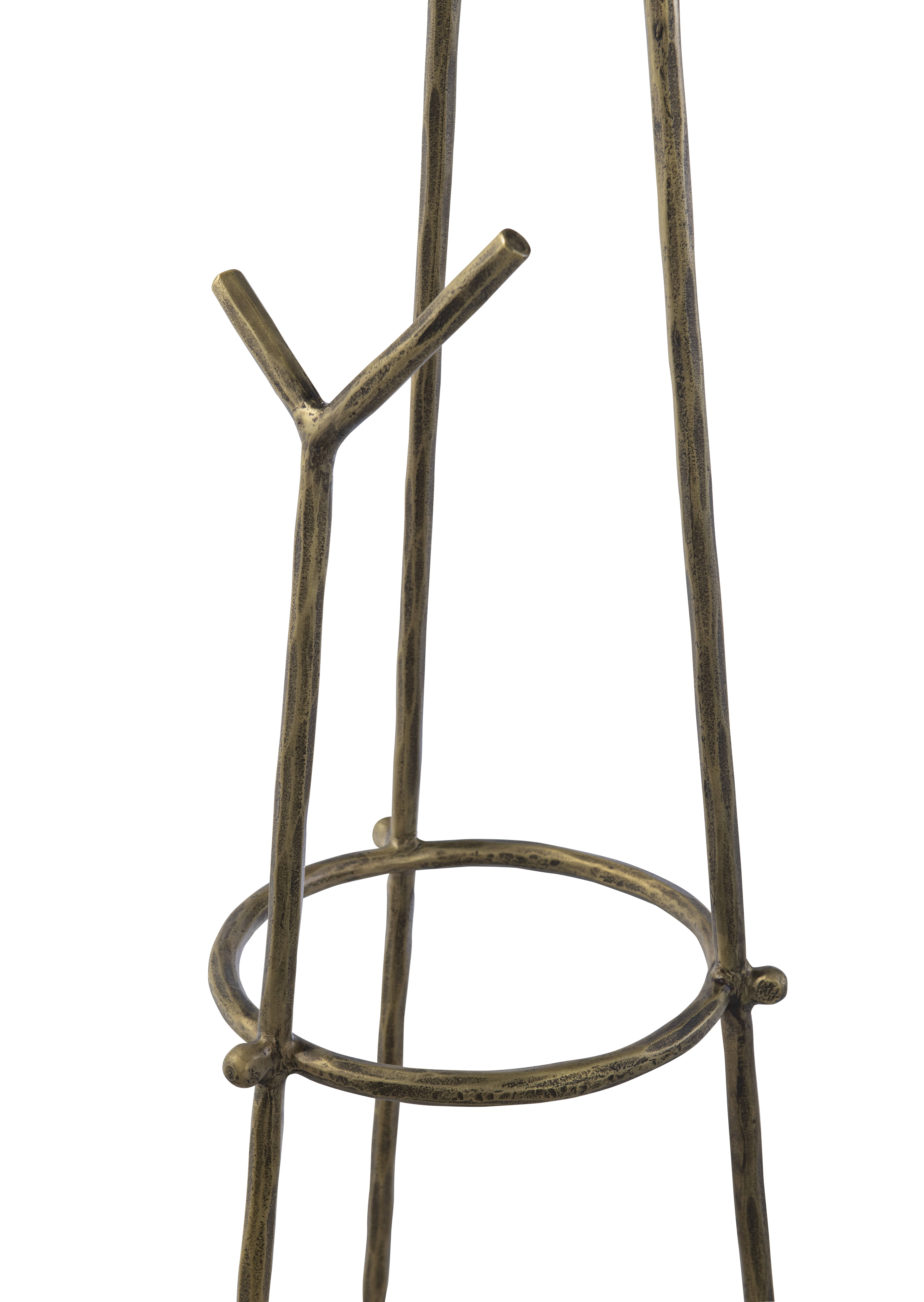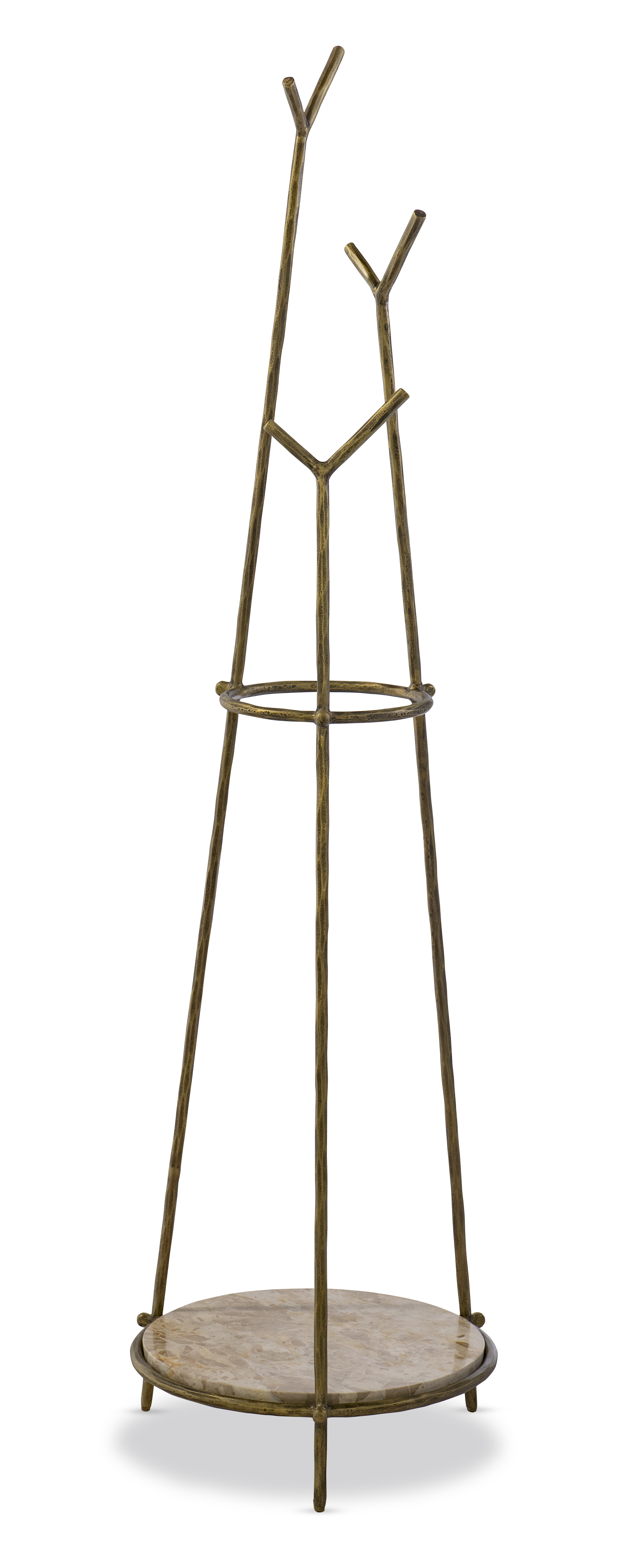 With the quiet character of a sculptural object discovered in a well-traveled home, the Oswald Coat Hanger transforms a simple necessity into a moment of decorative intrigue. Slender metal branches rise with an organic, almost arboreal gesture, forming a graceful stand for coats, hats, and scarves, while the circular lower shelf of warm stone offers a resting place for umbrellas or small belongings. Both practical and poetic in form, the piece feels reminiscent of a found object from a collector’s atelier—reflecting Maitland-Smith’s enduring appreciation for narrative design, storied materials, and the beauty of everyday rituals.
