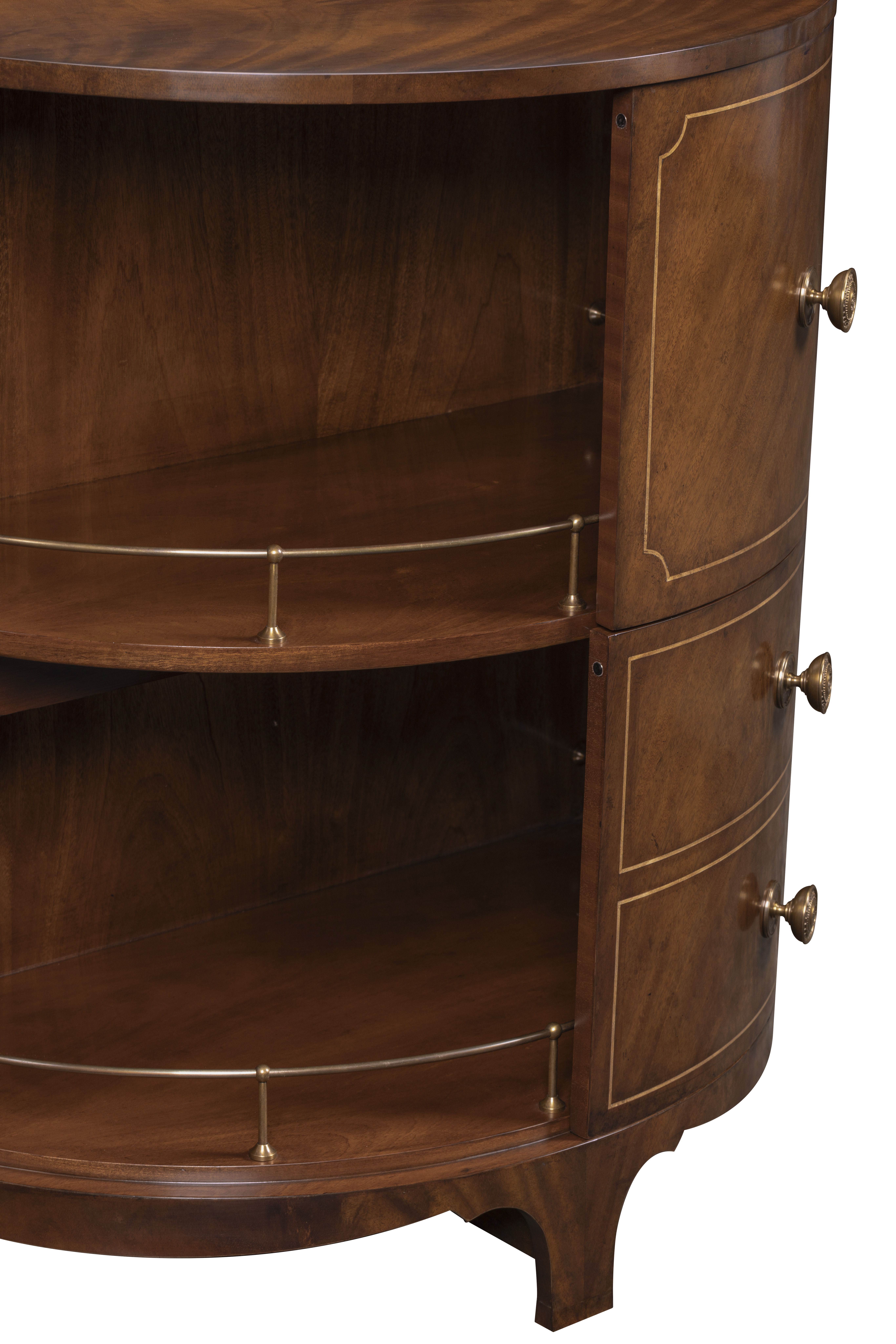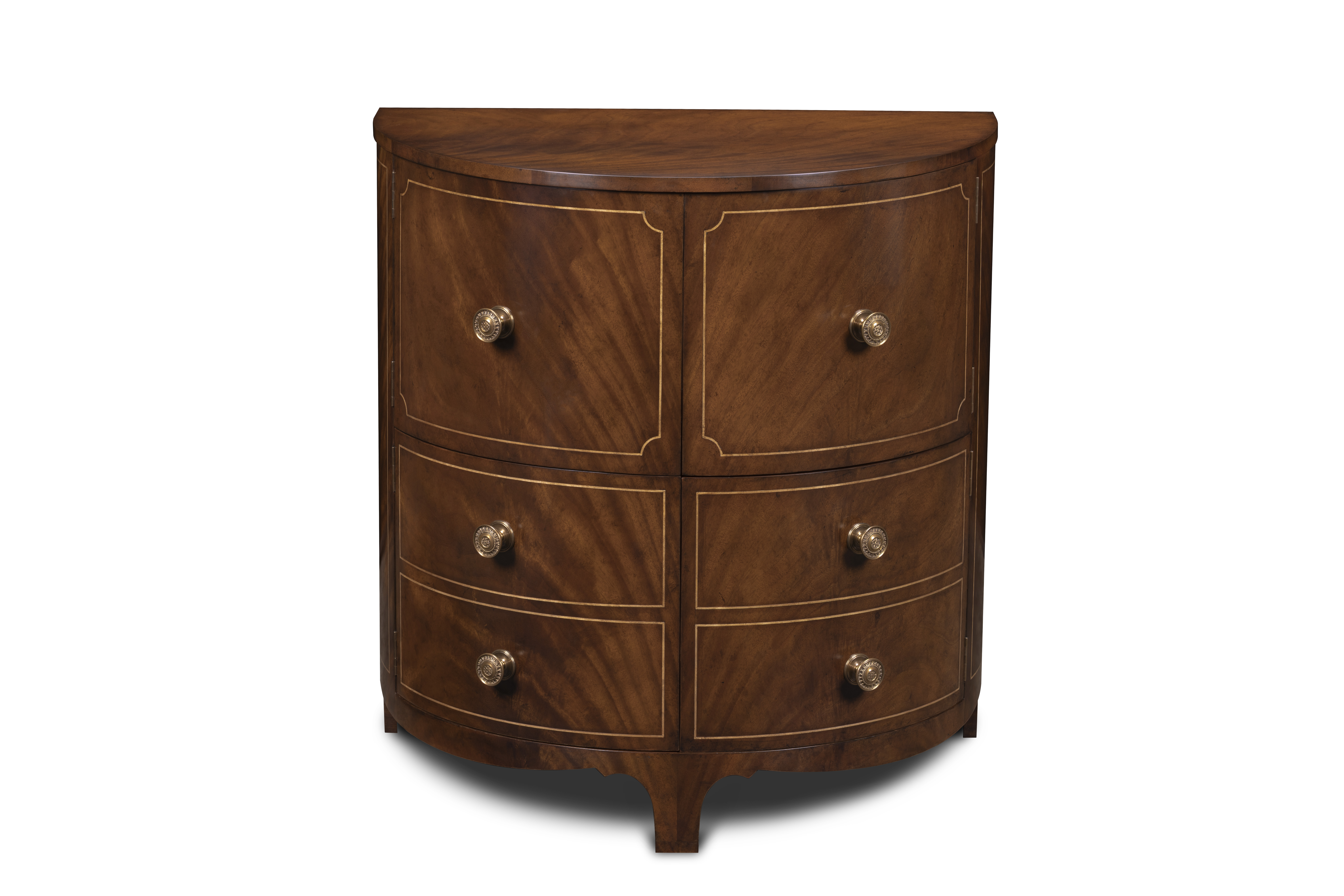 8636-51 Kingsley Liquor Cabinet W 34 D 20 H 36 This demilune chest, crafted from mahogany solids and veneers, captures the elegance of form and function that defines Maitland-Smith’s legacy. Gracefully curved and richly veneered, it opens to reveal a cleverly concealed interior with tiered shelving—an exquisite balance of artistry and purpose. Subtle line inlay and polished brass hardware lend the piece its final touch of timeless sophistication. In Stock