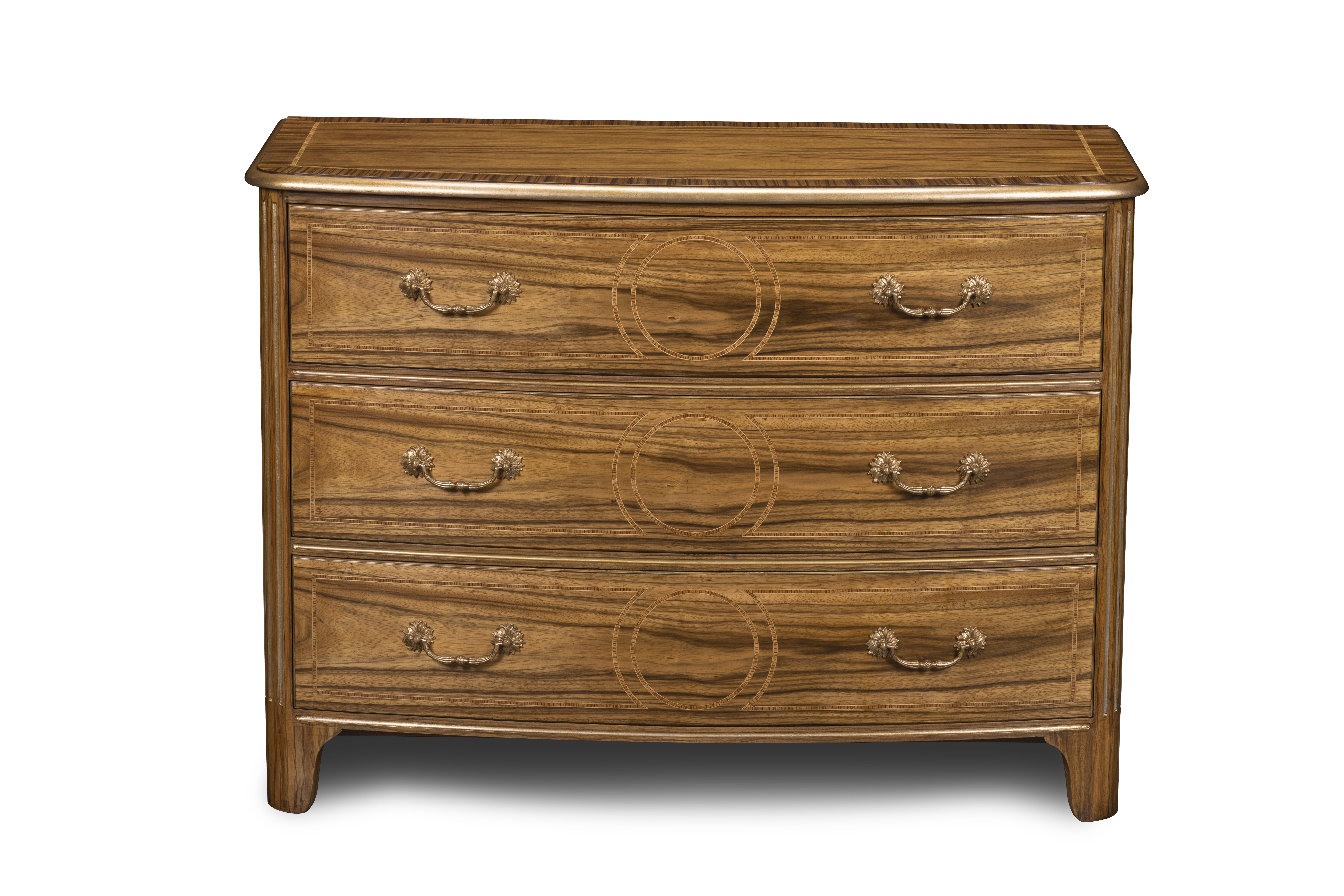 Graceful in form and rich in detail, this three-drawer chest showcases the artistry of matched veneers and fine craftsmanship. The flowing grain pattern is accentuated by delicate inlay and gilt-edge molding, while classic brass pulls add a note of timeless refinement. Subtly bowed and beautifully proportioned, it embodies Maitland-Smith’s signature harmony of elegance and craft.