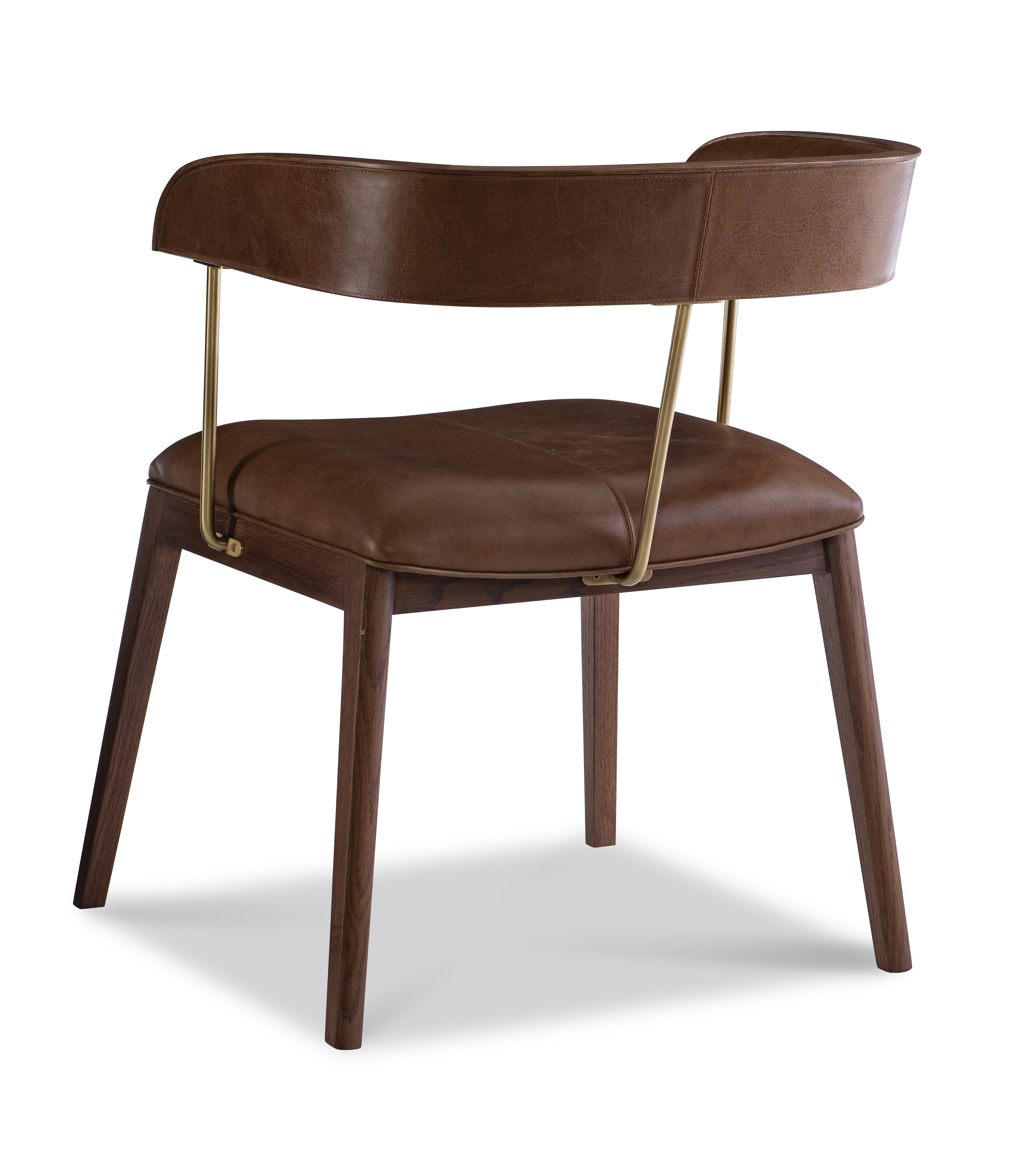 This curved-back leather armchair offers a refined blend of mid-century elegance and contemporary comfort. The softly contoured backrest wraps gently around the sitter, supported by slender brass rods that lend both strength and visual lightness. Upholstered in smooth tan leather and framed in warm wood, it’s a perfect balance of structure and softness.