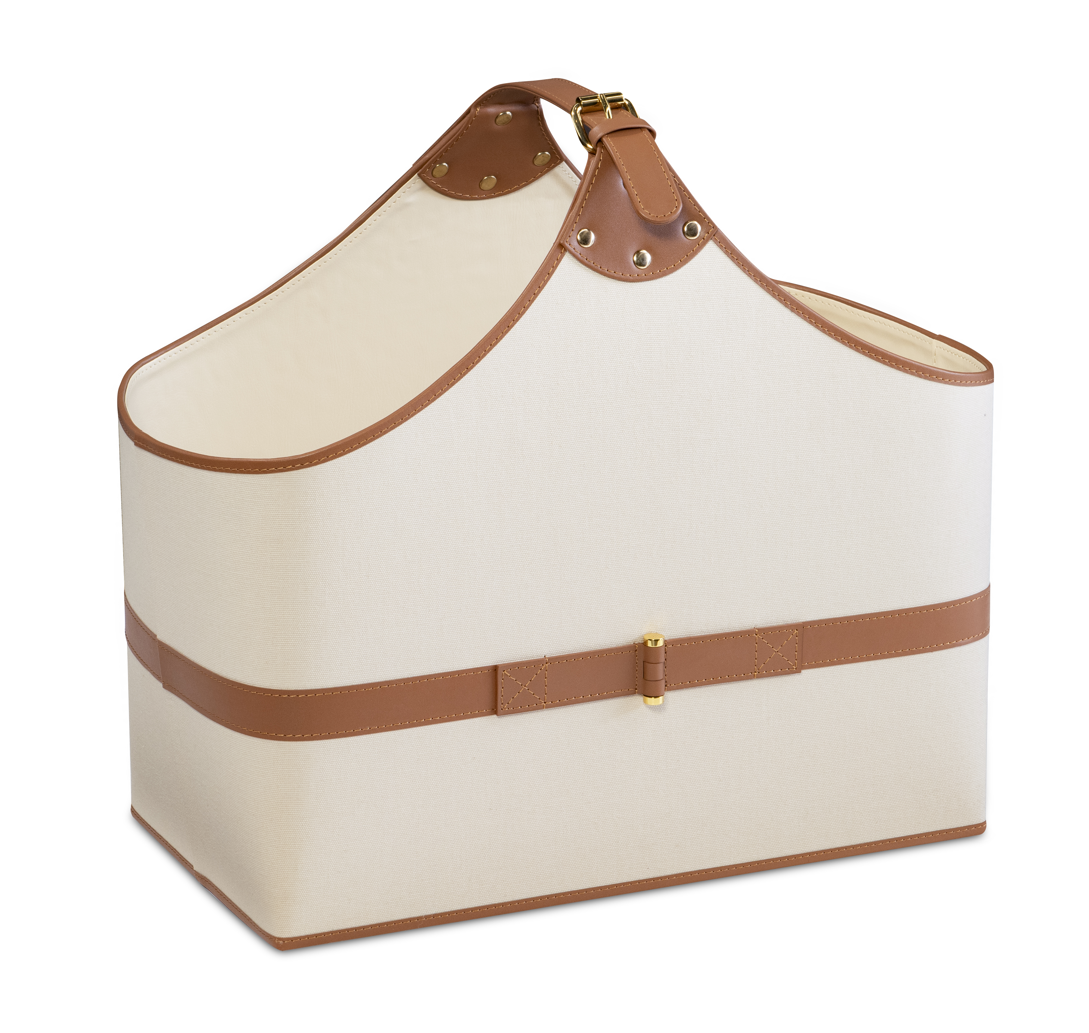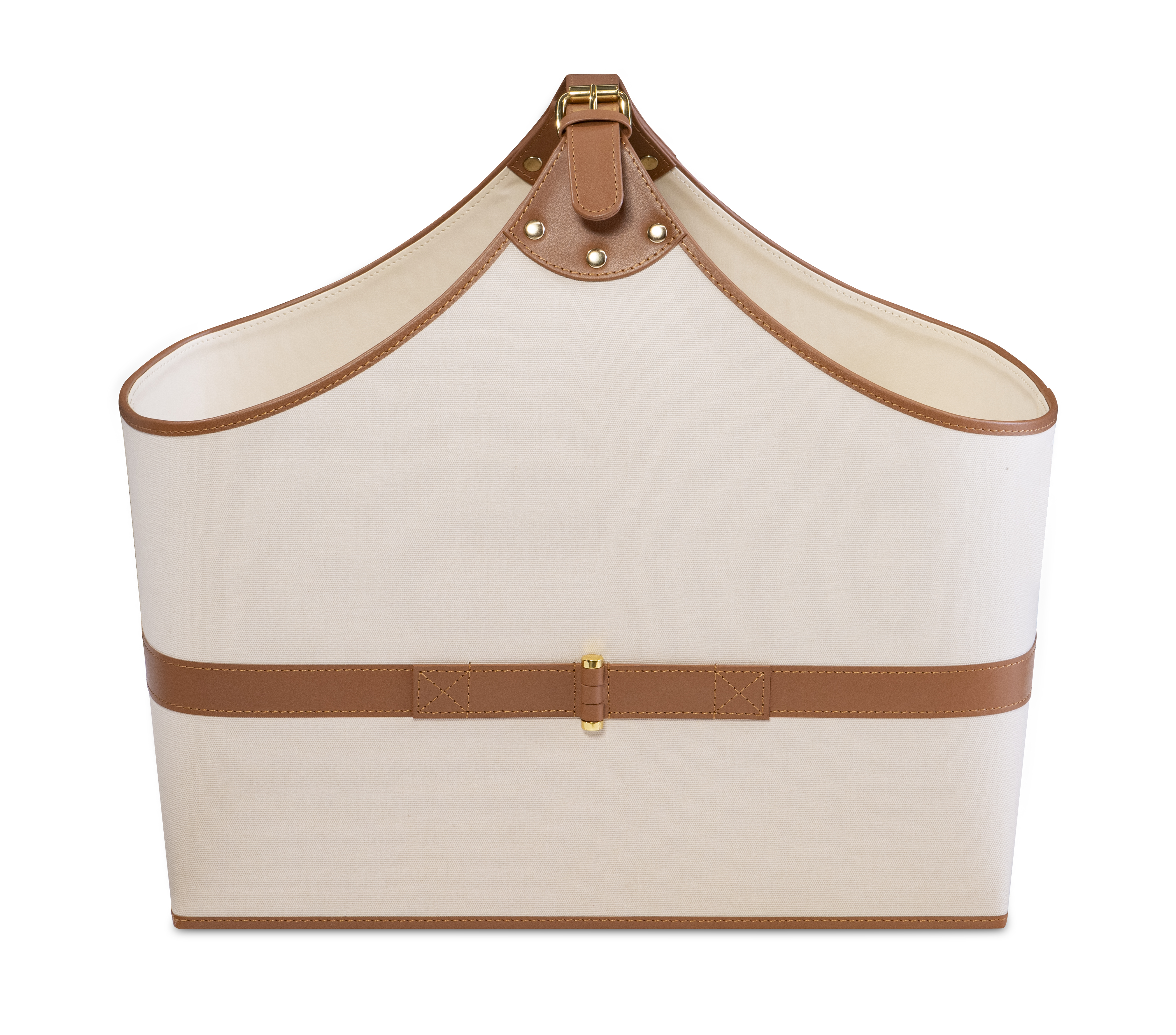 A study in tailored simplicity, this canvas and leather storage tote combines practicality with polished design. The natural woven body is framed in hand-stitched saddle leather with brass accents, offering both durability and sophistication. Ideal for magazines, throws, or fireside essentials, it lends effortless refinement to any interior.
