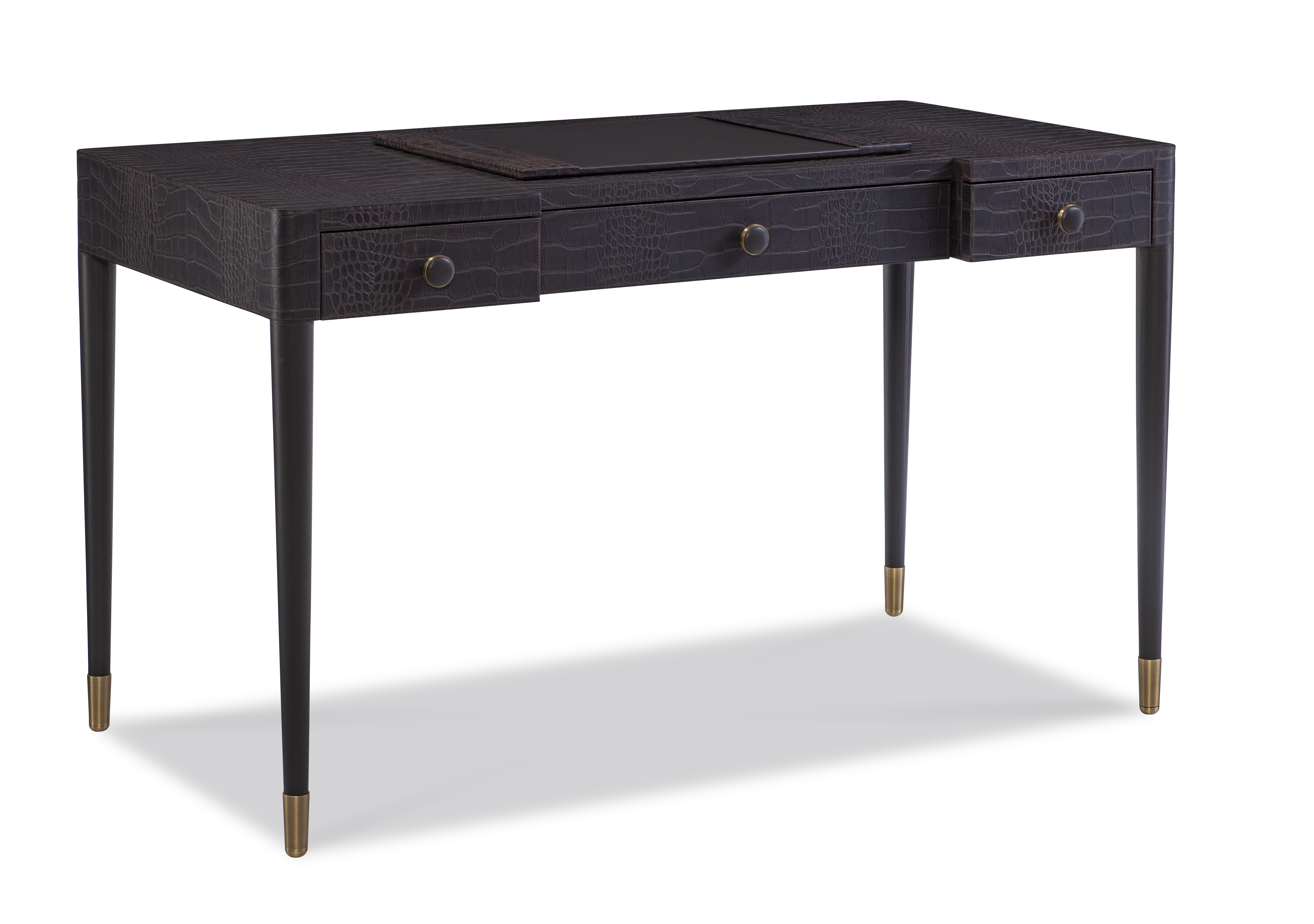Tailored and tactile, this desk combines sleek form with luxurious texture. Wrapped in embossed leather with a crocodile motif, it rests on slender, tapered legs accented by polished brass caps and sculpted hardware.