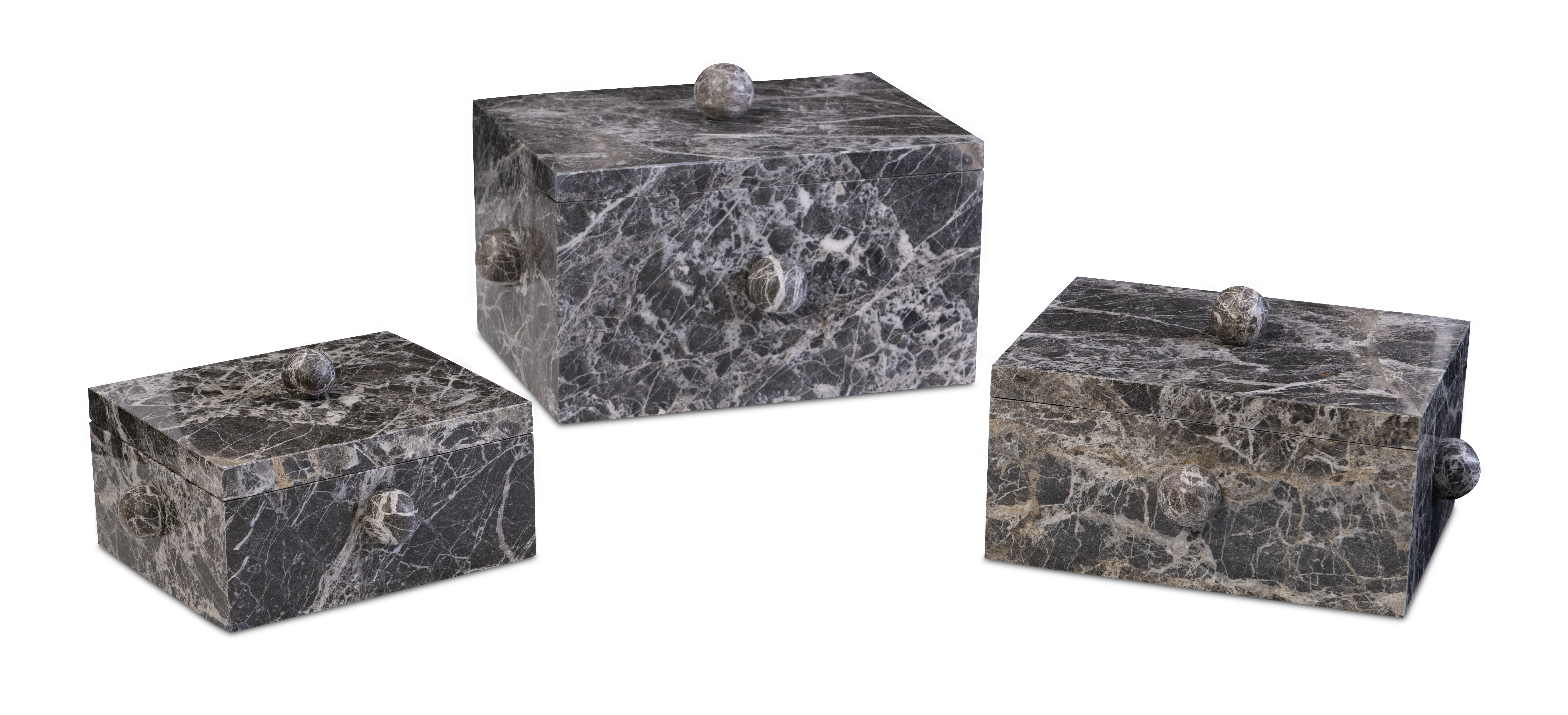 A study in proportion and texture, these nesting boxes are crafted from hand-finished stone composite with a soft, natural patina. Each piece is accented with a sculptural brass pull, lending a touch of understated opulence. Whether displayed as a trio or used individually, the collection evokes timeless elegance — a modern relic of form and function.