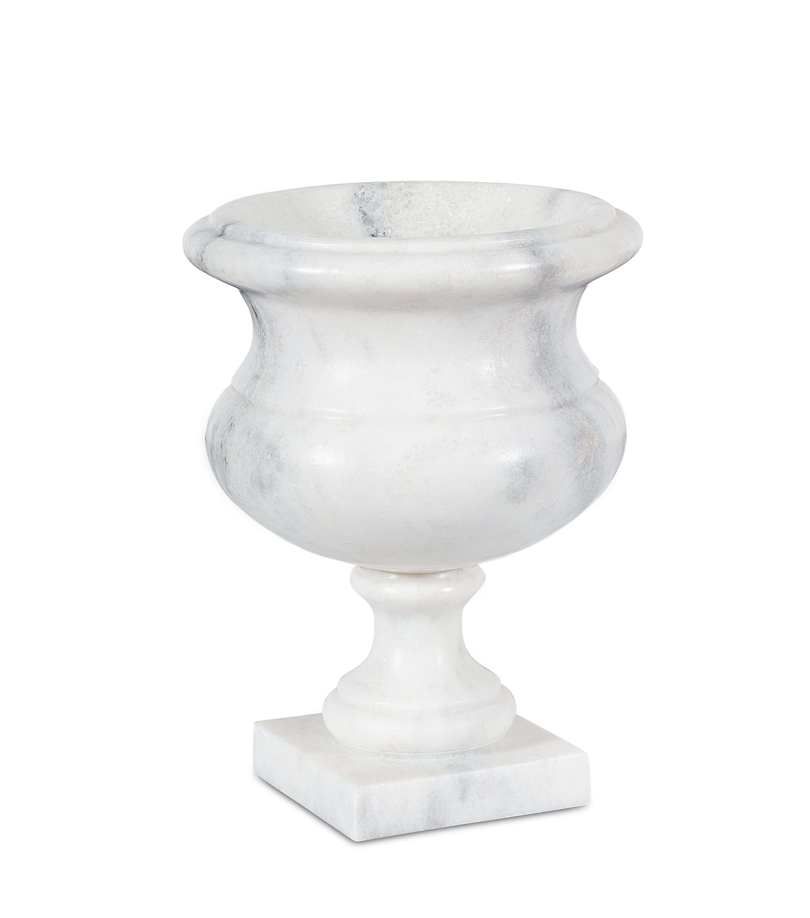 Named for the revered stone quarries of western India, the Ambaji Vase celebrates the quiet beauty of Ambaji marble, prized for its soft ivory tone and subtle natural character. The sculptural urn form, with its gently flared rim and pedestal base, lends the piece a timeless architectural presence that recalls classical garden vessels and collected antiquities. Natural variations in the marble ensure each example carries its own unique expression of the stone. Both decorative and sculptural, the vase reflects Maitland-Smith’s enduring appreciation for storied materials and timeless form.