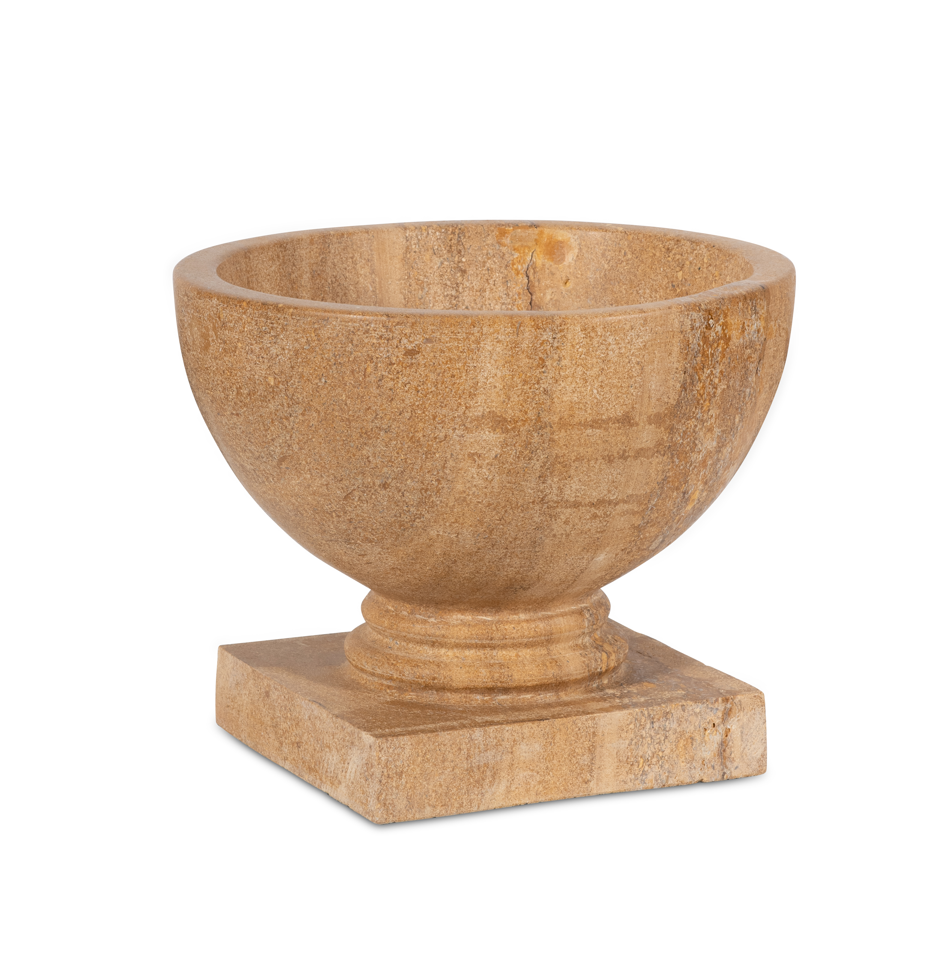 Pure in form and classical in spirit, the vase is a study in proportion and restraint. Its gently tapered vessel rests upon a squared plinth, echoing the disciplined geometry of ancient architecture. The warm, golden stone from Rajasthan, India, offers quiet sophistication—whether displayed as a standalone sculpture or filled with natural elements in a grand foyer or garden terrace.