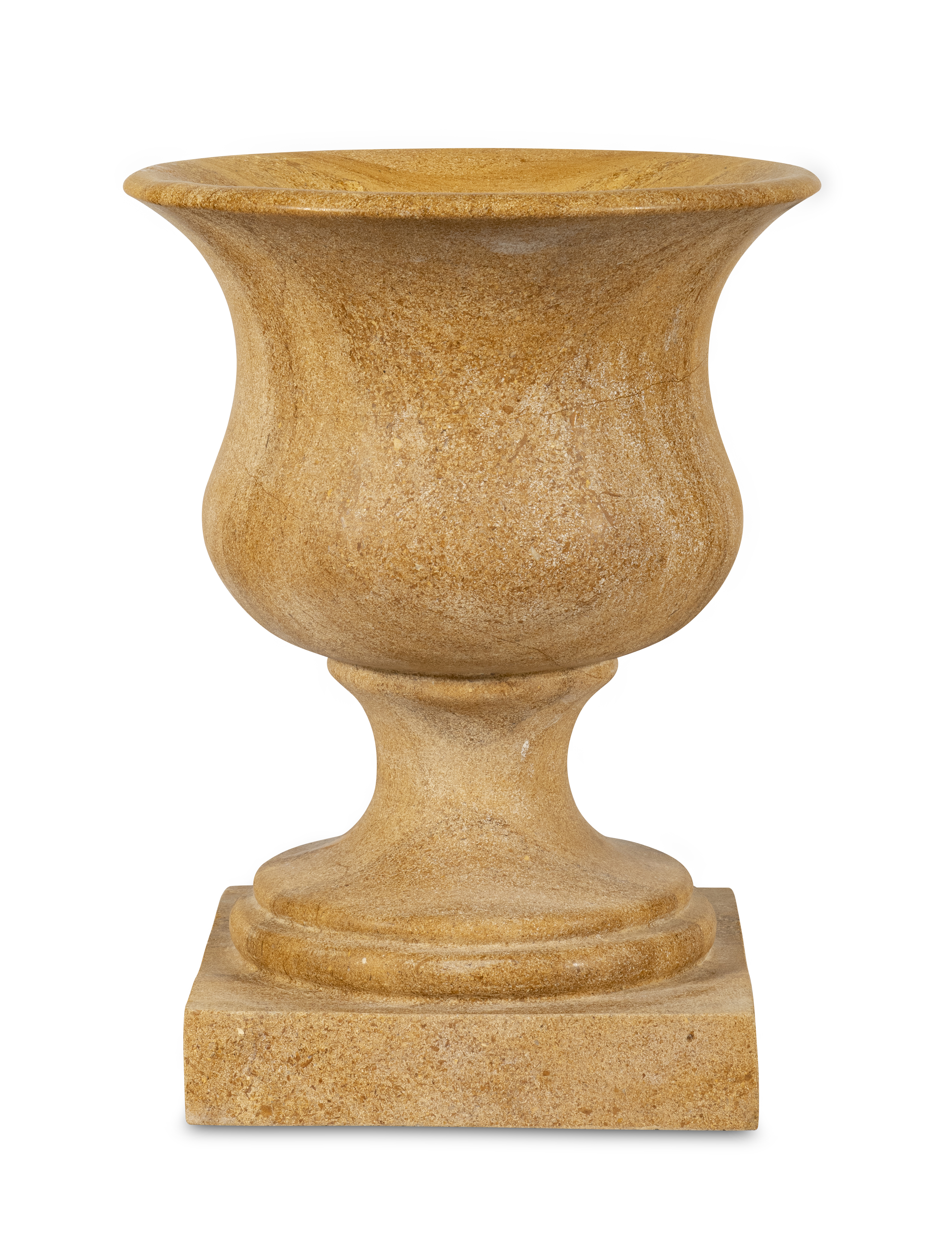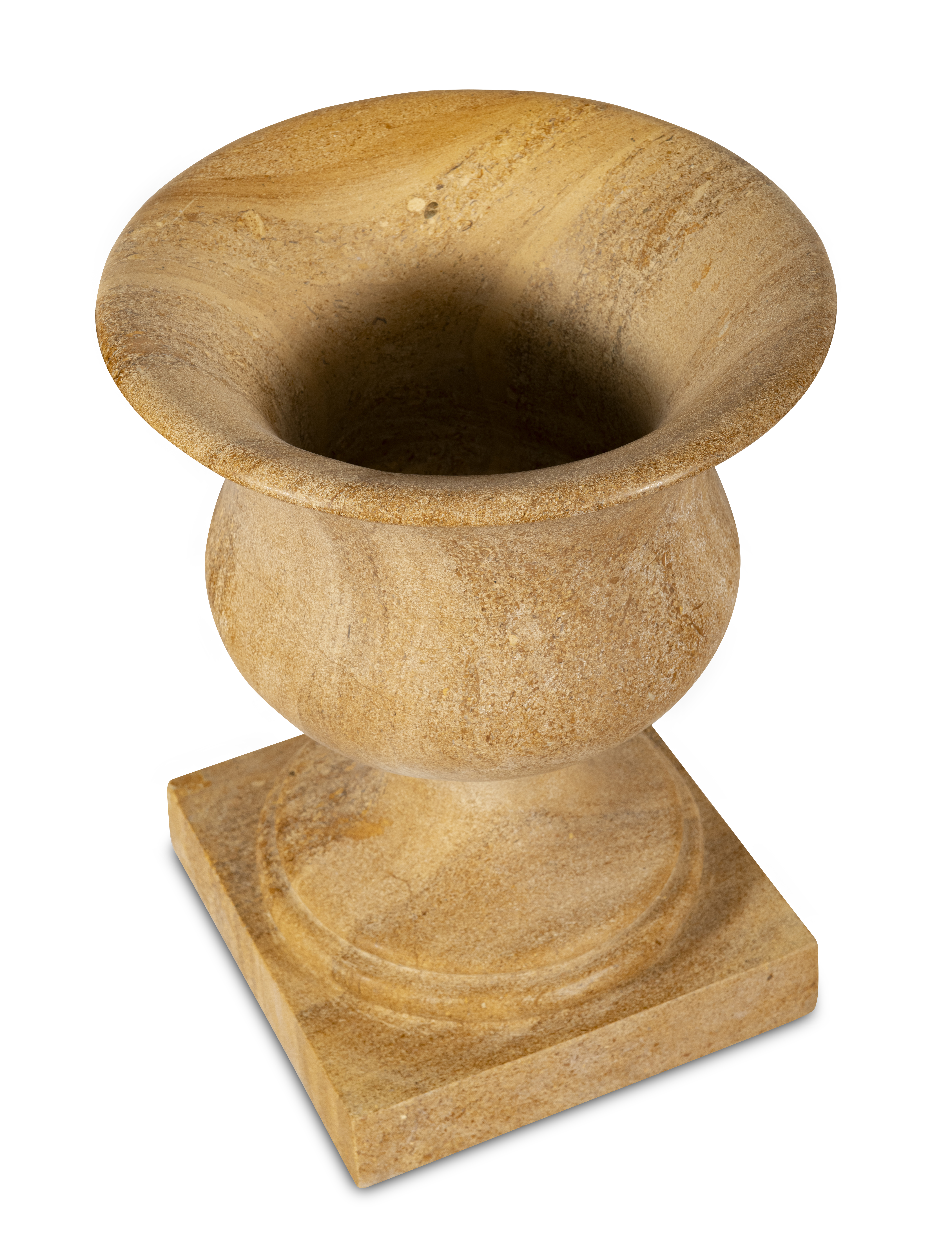 With its sweeping lip and balanced curvature, the vase captures the quiet elegance of classical antiquity. Its form—neither austere nor ornate—embodies the measured harmony found in ancient sculpture. Hand-finished in the warm, golden stone from Rajasthan, India, it radiates a subtle luminosity, serving as both vessel and sculpture. Whether framing an entry or standing sentinel on a terrace, it brings timeless serenity to any space.