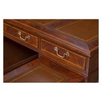 Crotch Mahogany writing desk with fine inlaid banding and Antique Brown Leather top, Brass hardware, and right side file drawer.