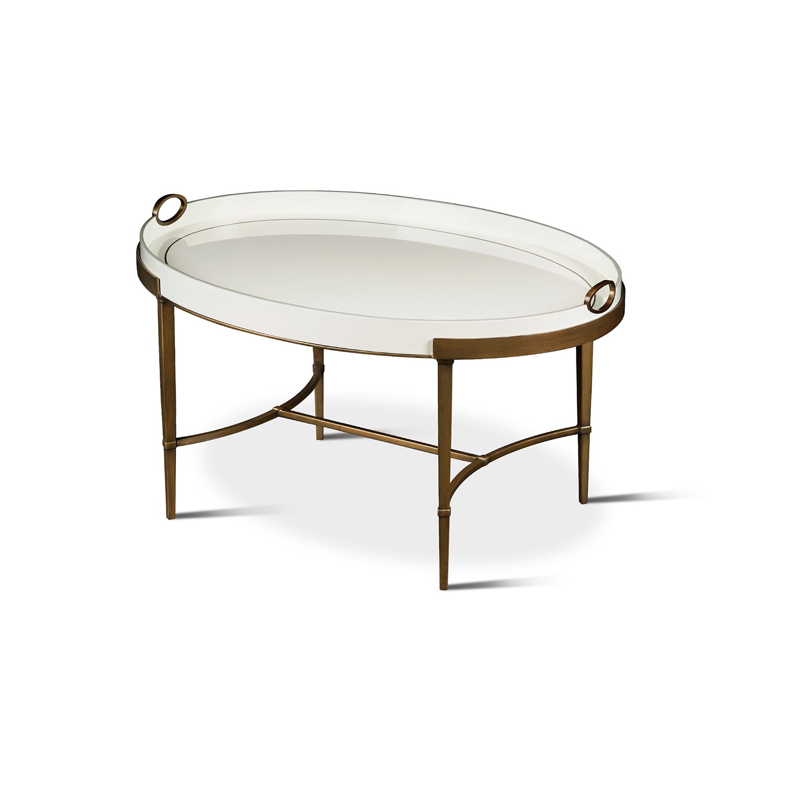 89-0608 Frost Cocktail Table (SH02-060719)W 38 D 27 H 21Lightly Antiqued Gold Iron and Cremona oval cocktail table with Brass handles. In Stock